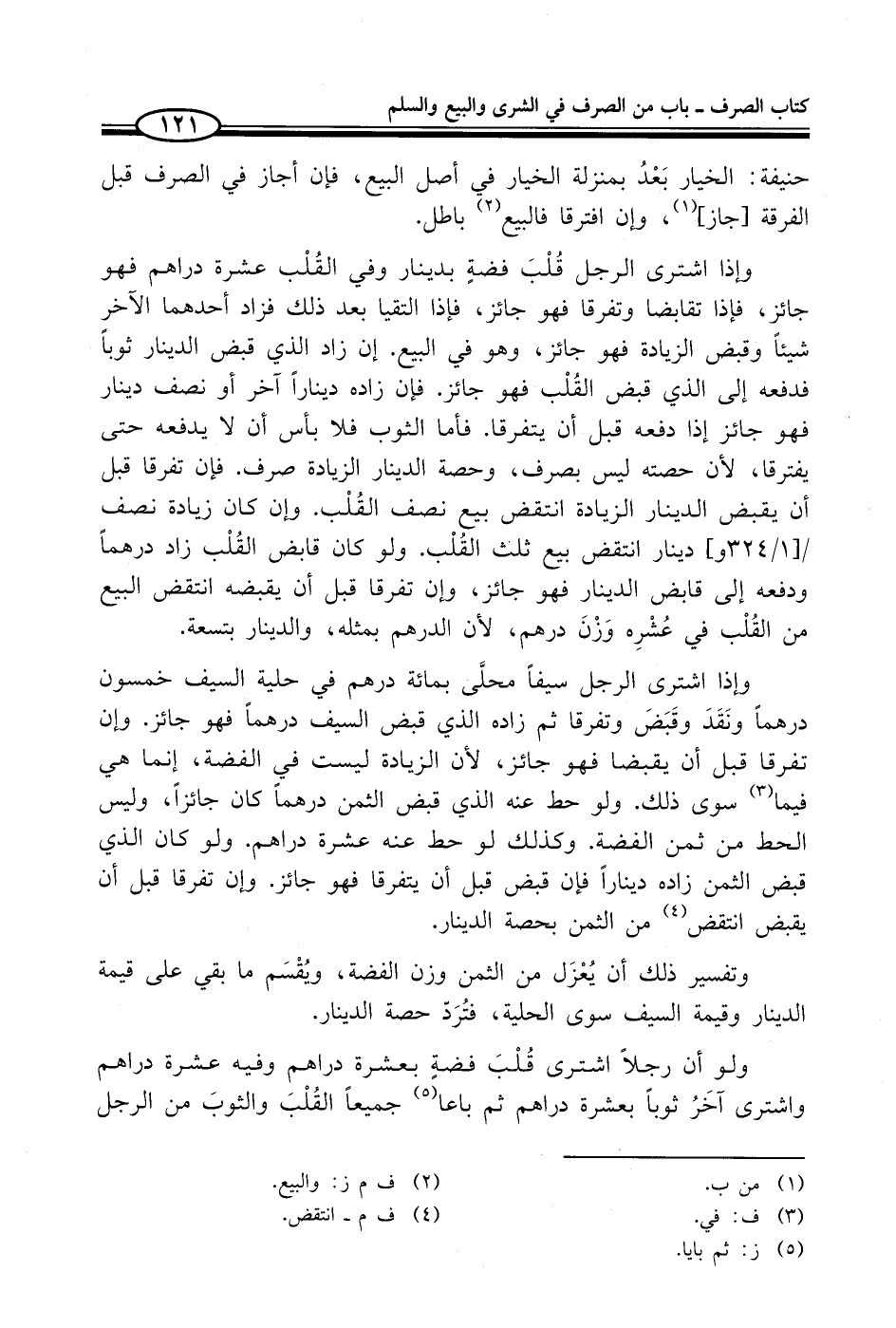 وإذا اشترى الرجل سيفاً محلَّى بمائة درهم في حلية السيف خمسون درهماً ونَقَدَ وقَبَضَ وتفرقا ثم زاده الذي قبض السيف درهماً فهو جائز. وإن تفرقا قبل أن يقبضا فهو جائز، لأن الزيادة ليست في الفضة، إنما هي فيما (¬3) سوى ذلك. ولو حط عنه الذي قبض الثمن درهماً كان جائزاً، وليس الحط من ثمن الفضة. وكذلك لو حط عنه عشرة دراهم. ولو كان الذي قبض الثمن زاده ديناراً فإن قبض قبل أن يتفرقا فهو جائز. وإن تفرقا قبل أن يقبض انتقض (¬4) من الثمن بحصة الدينار.