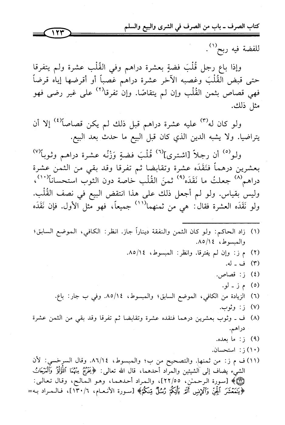 ولو (¬5) أن رجلاً [اشترى] (¬6) قُلْبَ فضةٍ وَزْنُه عشرة دراهم وثوباً (¬7) بعشرين درهماً فنَقَدَه عشرة وتقابضا ثم تفرقا وقد بقي من الثمن عشرة دراهم (¬8) جعلتُ ما نَقَدَه (¬9) ثمنَ القُلْب خاصة دون الثوب استحساناً (¬10)، وليس بقياس. ولو لم أجعل ذلك على هذا انتقض البيع في نصف القُلْب. ولو نَقَدَه العشرة فقال: هي من ثمنهما (¬11) جميعاً، فهو مثل الأول. فإن نَقَدَه