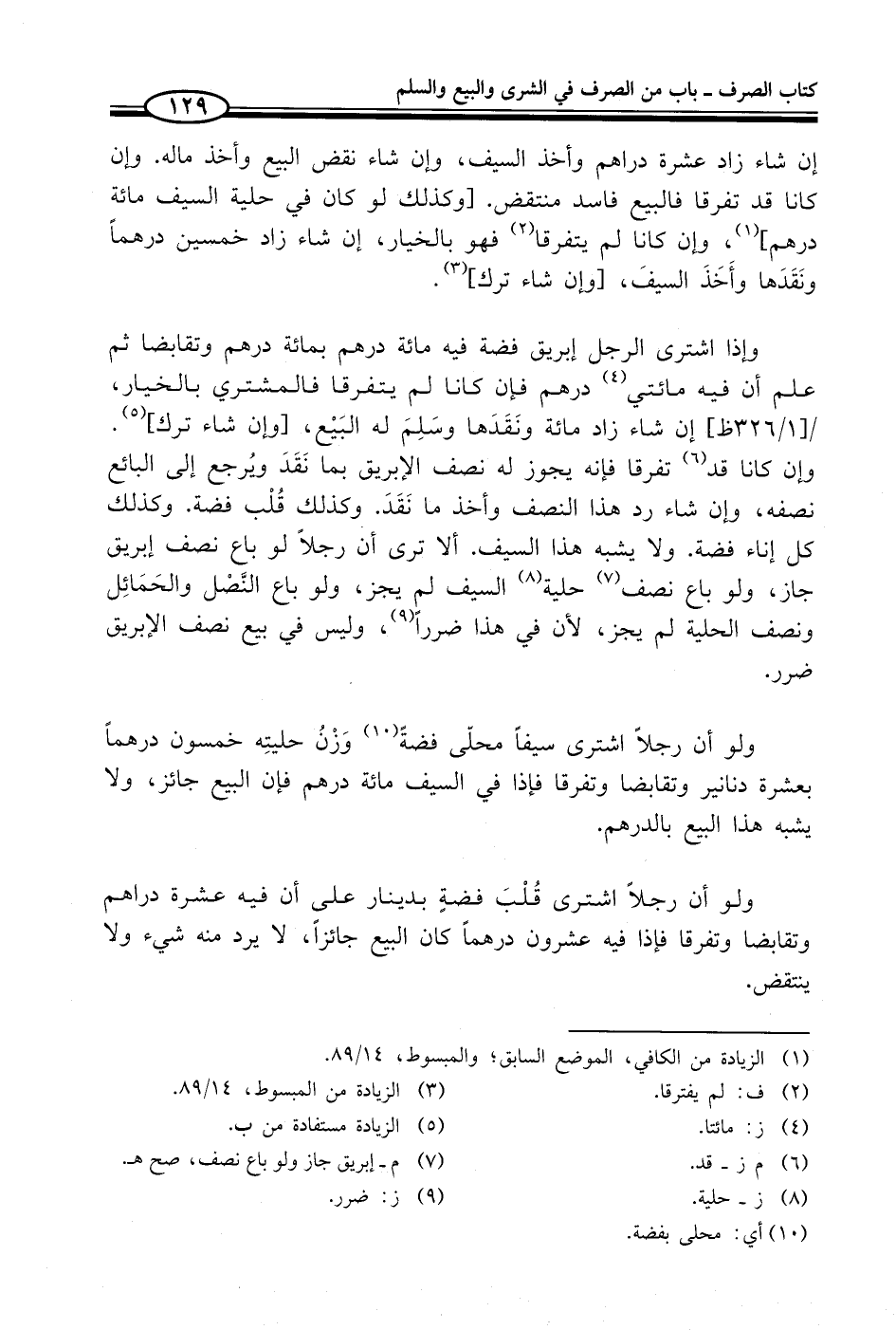 ولو أن رجلاً اشترى سيفاً محلّى فضةً (¬10) وَزْنُ حليتِه خمسون درهماً بعشرة دنانير وتقابضا وتفرقا فإذا في السيف مائة درهم فإن البيع جائز، ولا يشبه هذا البيع بالدرهم.