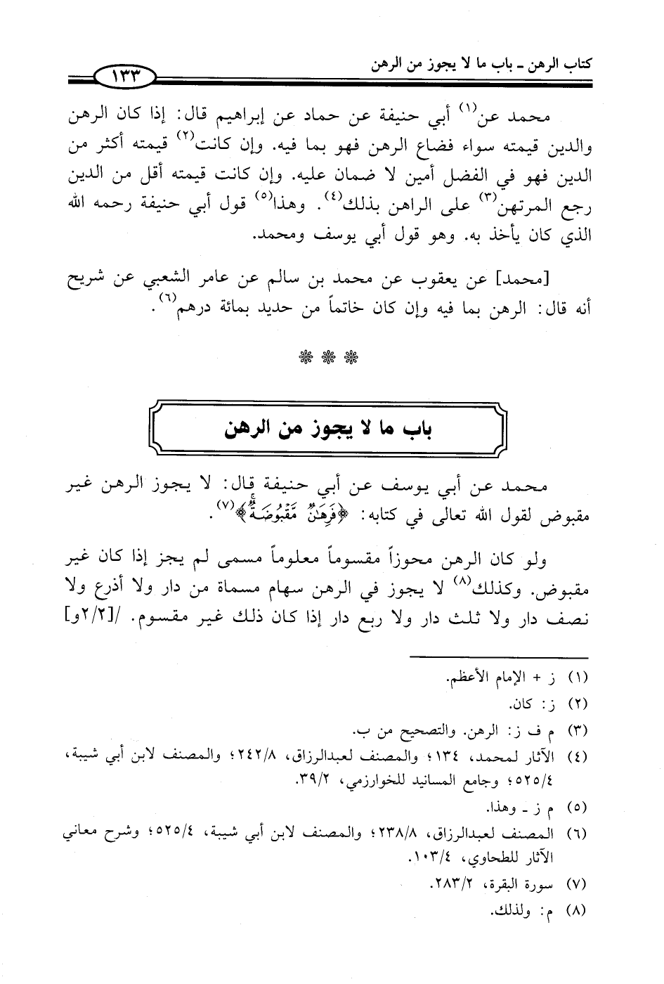 (¬4) الآثار لمحمد، 134؛ والمصنف لعبد الرزاق، 8/ 242؛ والمصنف لابن أبي شيبة، 4/ 525؛ وجامع المسانيد للخوارزمي، 2/ 39.