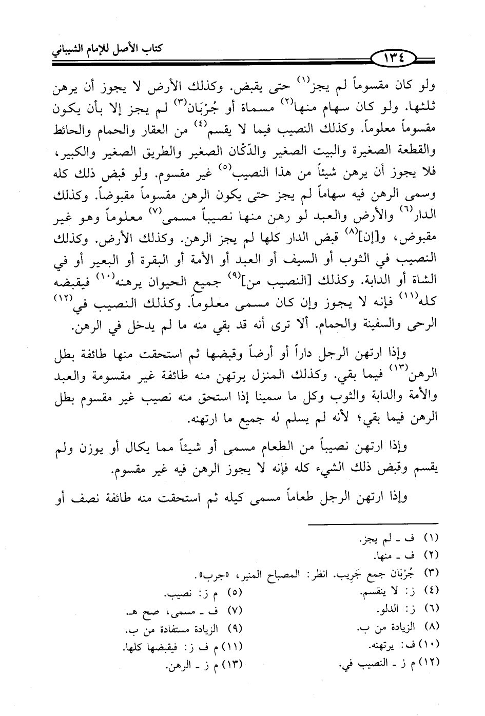 ولو كان مقسوماً لم يجز (¬1) حتى يقبض. وكذلك الأرض لا يجوز أن يرهن ثلثها. ولو كان سهام منها (¬2) مسماة أو جُرْبَان (¬3) لم يجز إلا بأن يكون مقسوماً معلوماً. وكذلك النصيب فيما لا يقسم (¬4) من العقار والحمام والحائط والقطعة الصغيرة والبيمت الصغير والدّكّان الصغير والطريق الصغير والكبير، فلا يجوز أن يرهن شيئأ من هذا النصيب (¬5) غير مقسوم. ولو قبض ذلك كله وسمى الرهن فيه سهاماً لم يجز حتى يكون الرهن مقسوماً مقبوضاً. وكذلك الدار (¬6) والأرض والعبد لو رهن منها نصيباً مسمى (¬7) معلوماً وهو غير مقبوض، و [إن] (¬8) قبض الدار كلها لم يجز الرهن. وكذلك الأرض. وكذلك النصيب في الثوب أو السيف أو العبد أو الأمة أو البقرة أو البعير أو في الشاة أو الدابة. وكذلك [النصيب من] (¬9) جميع الحيوان يرهنه (¬10) فيقبضه كله (¬11) فإنه لا يجوز وإن كان مسمى معلوماً. وكذلك النصيب في (¬12) الرحى والسفينة والحمام. ألا ترى أنه قد بقي منه ما لم يدخل في الرهن.
