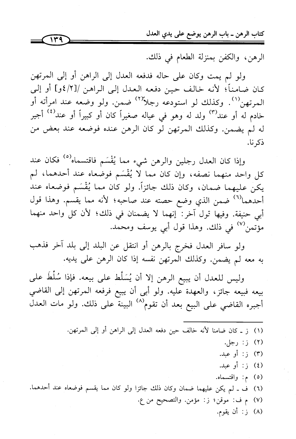 (¬1) ز - كان ضامنا لأنه خالف حين دفعه العدل إلى الراهن أو إلى المرتهن.