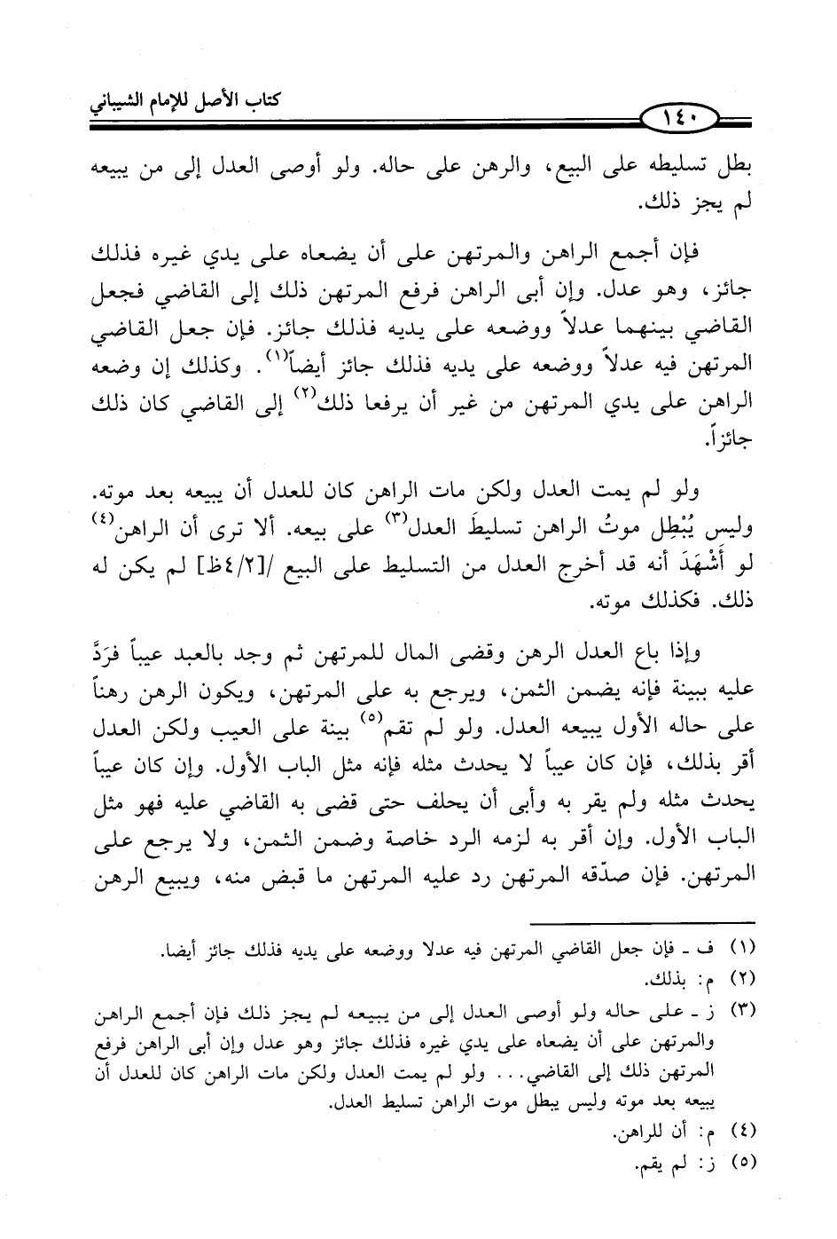 (¬3) ز - على حاله ولو أوصى العدل إلى من يبيعه لم يجز ذلك فإن أجمع الراهن والمرتهن على أن يضعاه على يدي غيره فذلك جائز وهو عدل وإن أبى الراهن فرفع المرتهن ذلك إلى القاضي ... ولو لم يصت العدل ولكن مات الراهن كان للعدل أن يبيعه بعد موته وليس يبطل موت الراهن تسليط العدل.