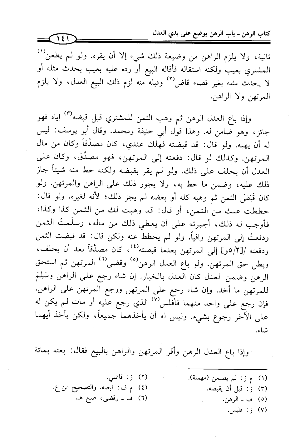 وإذا باع العدل الرهن ثم وهب الثمن للمشتري قبل قبضه (¬3) إياه فهو جائز، وهو ضامن له. وهذا قول أبي حنيفة ومحمد. وقال أبو يوسف: ليس له أن يهبه. ولو قال: قد قبضته فهلك عندي، كان مصدَّقاً وكان من مال المرتهن. وكذلك لو قال: دفعته إلى المرتهن، فهو مصدَّق، وكان على العدل أن يحلف على ذلك. ولو لم يقر بقبضه ولكنه حط منه شيئاً جاز ذلك عليه، وضمن ما حط به، ولا يجوز ذلك على الراهن والمرتهن. ولو كان قَبَضَ الثمن ثم وهبه كله أو بعضه لم يجز ذلك؛ لأنه لغيره. ولو قال: حططت عنك من الثمن، أو قال: قد وهبت لك من الثمن كذا وكذا، فأوجب له ذلك، أجبرته على أن يعطي ذلك من ماله، وسلّمتُ الثمن ودفعتُ إلى المرتهن وافياً. ولو لم يحطط عنه ولكن قال: قد قبضت الثمن ودفعته إلى المرتهن بعدما قبضته (¬4)، كان مصدَّقاً بعد أن يحلف، وبطل حق المرتهن. ولو باع العدل الرهن (¬5) وقضى (¬6) المرتهن ثم استحق الرهن وضمن العدل كان العدل بالخيار. إن شاء رجع على الراهن وسَلِمَ للمرتهن ما أخذ. وإن شاء رجع على المرتهن ورجع المرتهن على الراهن. فإن رجع على واحد منهما فأفلس (¬7) الذي رجع عليه أو مات لم يكن له على الآخر رجوع بشيء. وليس له أن يأخذهما جميعاً، ولكن يأخذ أيهما شاء.