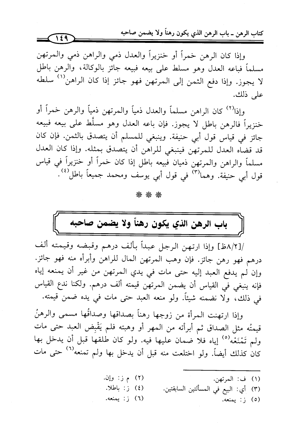 وإذا (¬2) كان الراهن مسلماً والعدل ذمياً والمرتهن ذمياً والرهن خمراً أو خنزيراً فالرهن باطل لا يجوز. فإن باعه العدل وهو مسلَّط على بيعه فبيعه جائز في قياس قول أبي حنيفة. وينبغي للمسلم أن يتصدق بالثمن. فإن كان قد قضاه العدل للمرتهن فينبغي للراهن أن يتصدق بمثله. وإذا كان العدل مسلماً والراهن والمرتهن ذميان فبيعه باطل إذا كان خمراً أو خنزيراً في قياس قول أبي حنيفة. وهما (¬3) في قول أبي يوسف ومحمد جميعاً باطل (¬4).