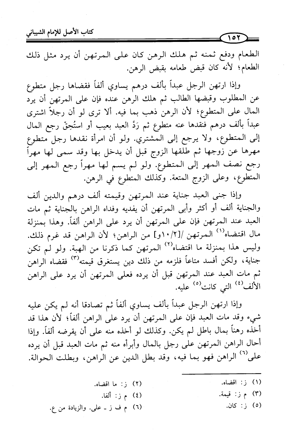 وإذا جنى العبد جناية عند المرتهن وقيمته ألف درهم والدين ألف والجناية ألف أو أكثر وأبى المرتهن أن يفديه وفداه الراهن بالجناية ثم مات العبد عند المرتهن فإن على المرتهن أن يرد على الراهن ألفاً. وهذا بمنزلة مال اقتضاه (¬1) المرتهن من الراهن؛ لأن الراهن قد غرم ذلك. وليس هذا بمنزلة ما اقتضاه (¬2) المرتهن كما ذكرنا من الهبة. ولو لم تكن جناية، ولكن أفسد متاعاً فلزمه من ذلك دين يستغرق قيمته (¬3) فقضاه الراهن ثم مات العبد عند المرتهن قبل أن يرده فعلى المرتهن أن يرد على الراهن الألف (¬4) التي كانت (¬5) عليه.