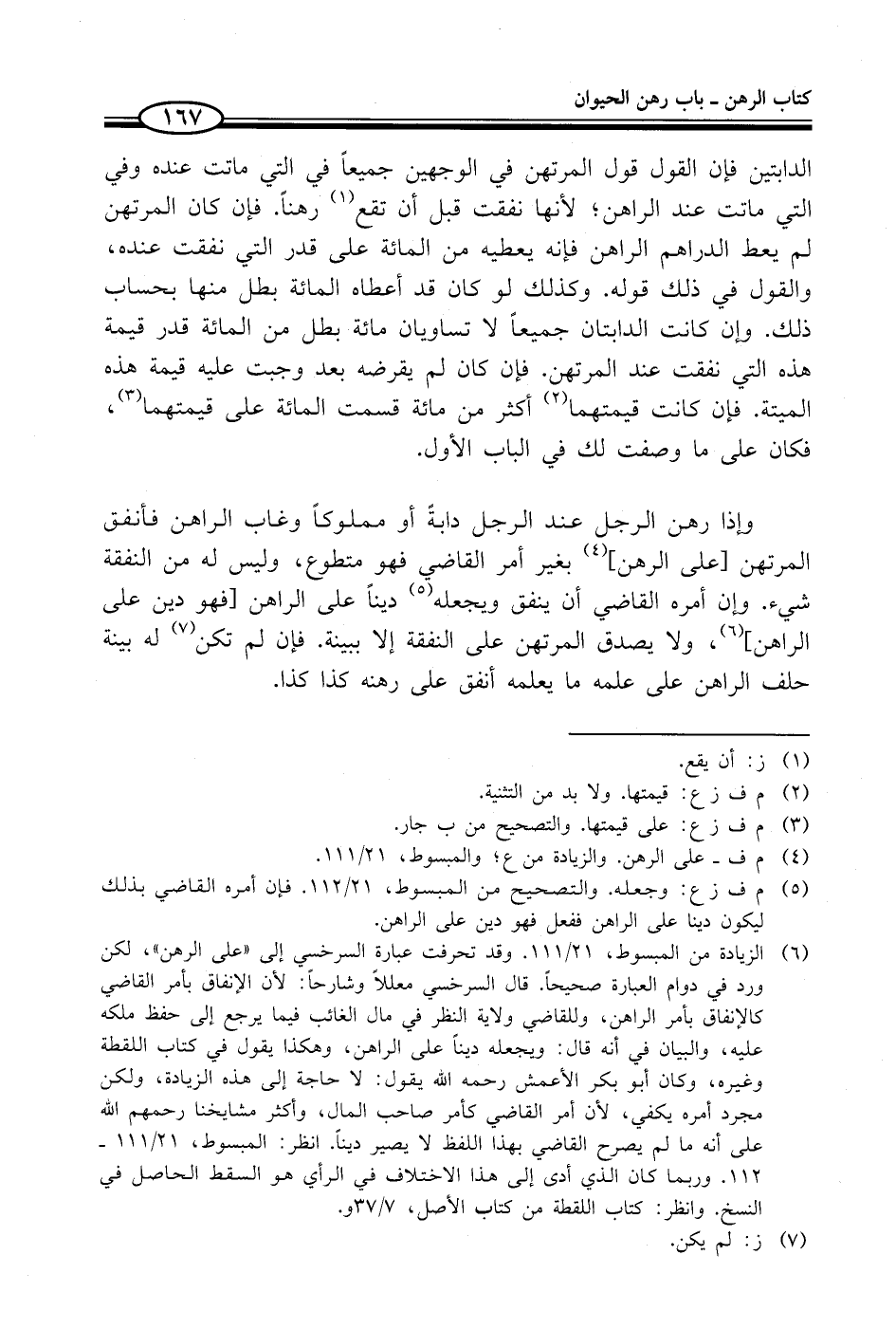 (¬6) الزيادة من المبسوط، 21/ 111. وقد تحرفت عبارة السرخسي إلى "على الرهن"، لكن ورد في دوام العبارة صحيحاً. قال السرخسي معللاً وشارحاً: لأن الإنفاق بأمر القاضي كالإنفاق بأمر الراهن، وللقاضي ولاية النظر في مال الغائب فيما يرجع إلى حفظ ملكه عليه، والبيان في أنه قال: ويجعله ديناً على الراهن، وهكذا يقول في كتاب اللقطة وغيره، وكان أبو بكر الأعمش -رحمه الله- يقول: لا حاجة إلى هذه الزيادة، ولكن مجرد أمره يكفي، لأن أمر القاضي كأمر صاحب المال، وأكثر مشايخنا -رحمهم الله- على أنه ما لم يصرح القاضي بهذا اللفظ لا يصير ديناً. انظر: المبسوط، 21/ 111 - 112. وربما كان الذي أدى إلى هذا الاختلاف في الرأي هو السقط الحاصل في النسخ. وانظر: كتاب اللقطة من كتاب الأصل، 7/ 37 و.