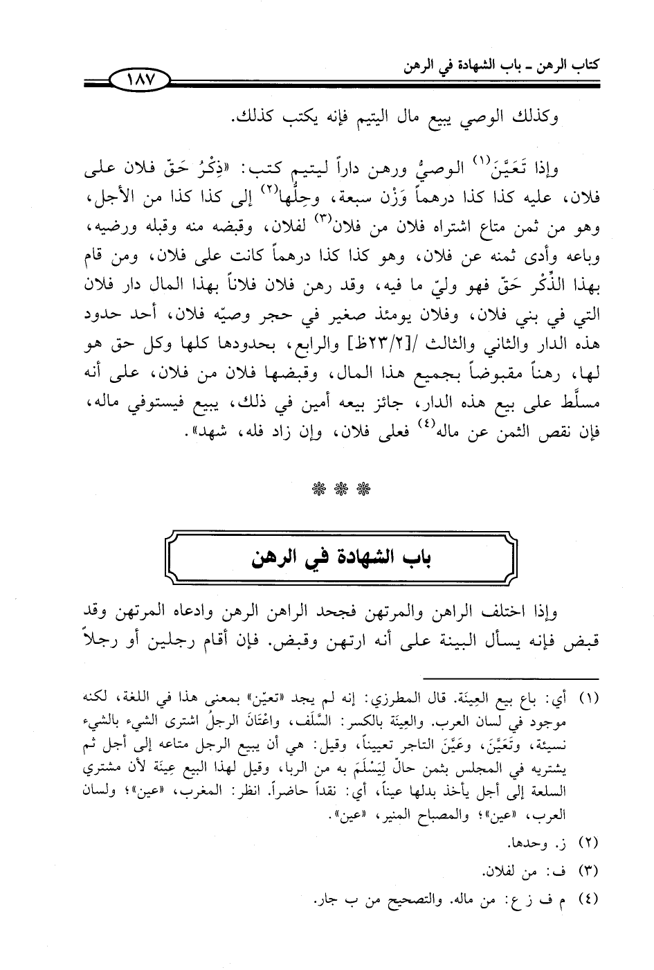 وإذا تَعَيَّنَ (¬1) الوصيُّ ورهن داراً ليتيبم كتب: "ذِكْرُ حَقّ فلان على فلان، عليه كذا كذا درهماً وَزْن سبعة، وحِلّها (¬2) إلى كذا كذا من الأجل، وهو من ثمن متاع اشتراه فلان من فلان (¬3) لفلان، وقبضه منه وقبله ورضيه، وباعه وأدى ثمنه عن فلان، وهو كذا كذا درهماً كانت على فلان، ومن قام بهذا الذكْر حَقّ فهو وليّ ما فيه، وقد رهن فلان فلاناً بهذا المال دار فلان التي في بني فلان، وفلان يومئذ صغير في حجر وصيّه فلان، أحد حدود هذه الدار والثاني والثالث والرابع، بحدودها كلها وكل حق هو لها، رهناً مقبوضاً بجميع هذا المال، وقبضها فلان من فلان، على أنه مسلَّط على بيع هذه الدار، جائز بيعه أمين في ذلك، يبيع فيستوفي ماله، فإن نقص الثمن عن ماله (¬4) فعلى فلان، وإن زاد فله، شهد".