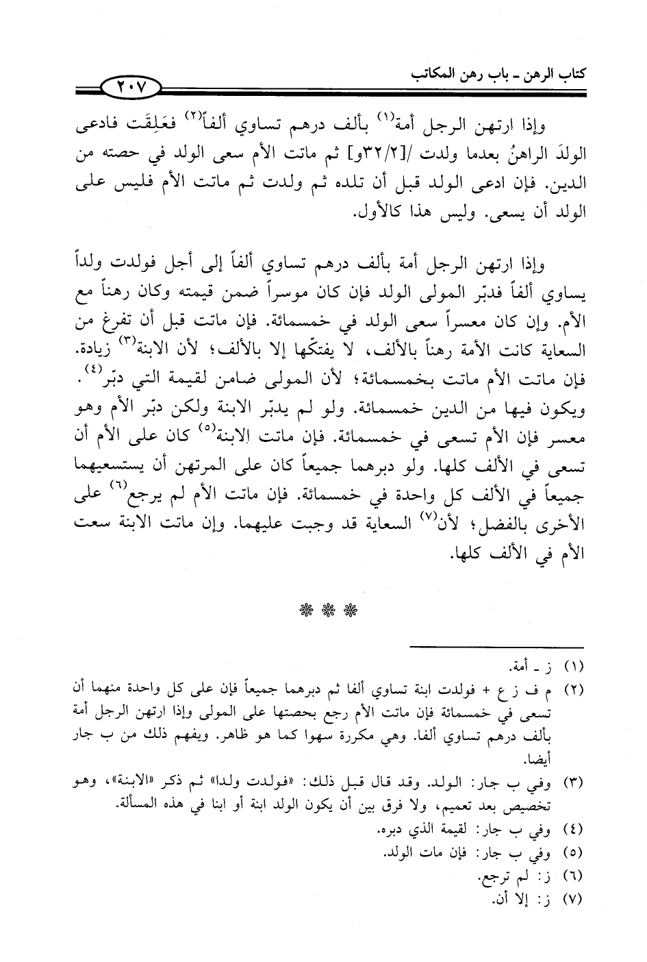 (¬2) م ف ز ع + فولدت ابنة تساوي ألفا ثم دبرهما جميعاً فإن على كل واحدة منهما أن تسعى في خمسمائة فإن ماتت الأم رجع بحصتها على المولى وإذا ارتهن الرجل أمة بألف درهم تساوي ألفا. وهي مكررة سهوا كما هو ظاهر. ويفهم ذلك من ب جار أيضا.