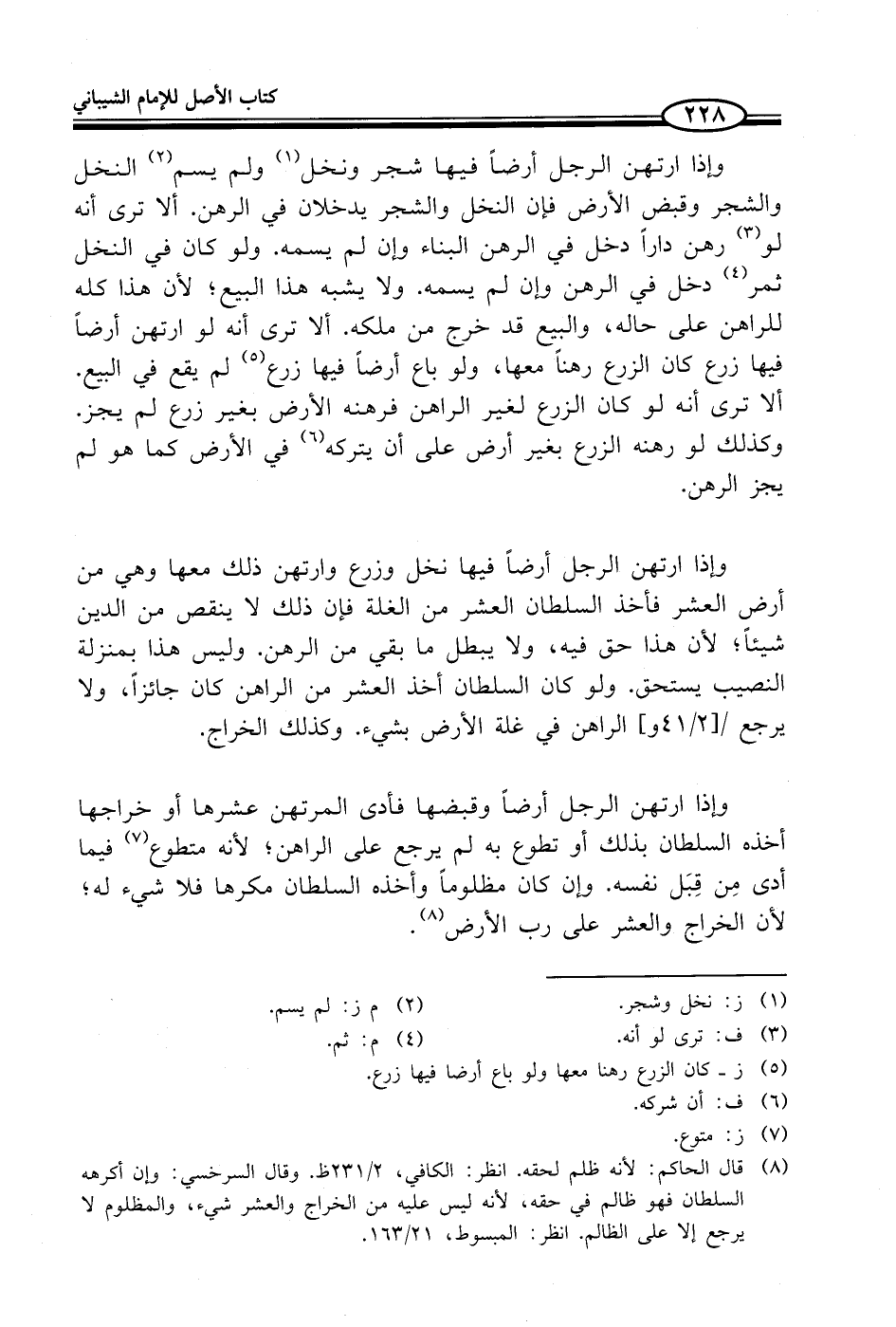 وإذا ارتهن الرجل أرضاً فيها نخل وزرع وارتهن ذلك معها وهي من أرض العشر فأخذ السلطان العشر من الغلة فإن ذلك لا ينقص من الدين شيئاً؛ لأن هذا حق فيه، ولا يبطل ما بقي من الرهن. وليس هذا بمنزلة النصيب يستحق. ولو كان السلطان أخذ العشر من الراهن كان جائزاً، ولا يرجع الراهن في غلة الأرض بشيء. وكذلك الخراج.