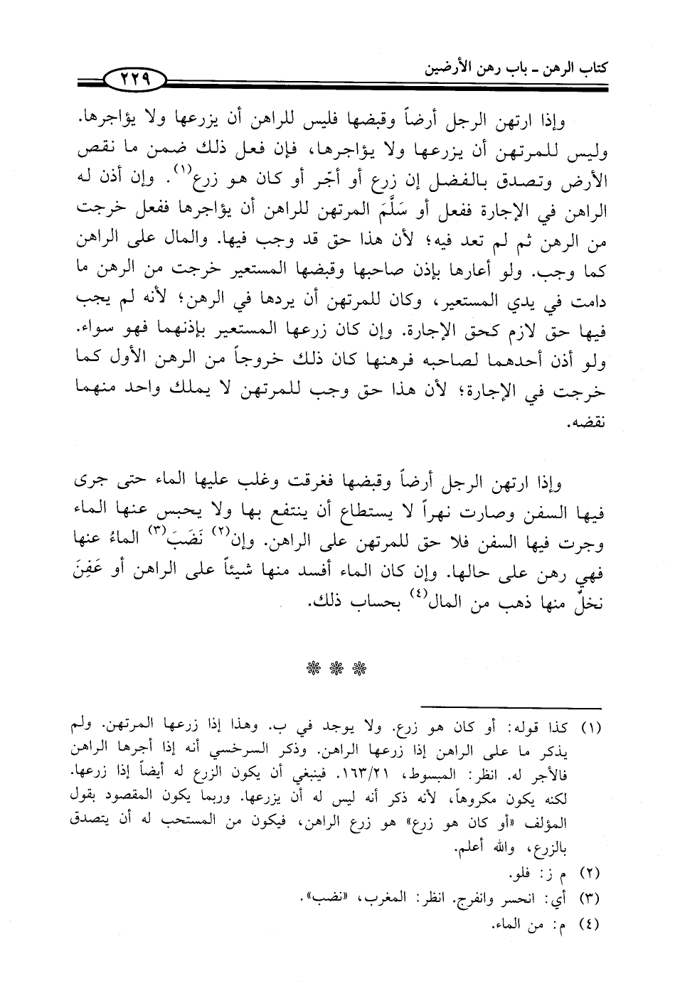 وإذا ارتهن الرجل أرضاً وقبضها فغرقت وغلب عليها الماء حتى جرى فيها السفن وصارت نهراً لا يستطاع أن ينتفع بها ولا يحبس عنها الماء وجرت فيها السفن فلا حق للمرتهن على الراهن. وإن (¬2) نَضَبَ (¬3) الماءُ عنها فهي رهن على حالها. وإن كان الماء أفسد منها شيئاً على الراهن أو عَفِنَ نخلٌ منها ذهب من المال (¬4) بحساب ذلك.