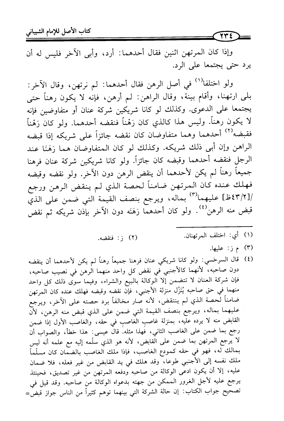 (¬4) قال السرخسي: ولو كانا شريكي عنان فرهنا جميعاً رهناً لم يكن لأحدهما أن ينقضه دون صاحبه، لأنهما كالأجنبي في نقض كل واحد منهما الرهن في نصيب صاحبه، فإن شركة العنان لا تتضمن إلا الوكالة بالبيع والشراء، وفيما سوى ذلك كل واحد منهما في حق صاحبه يُنَزَّل منزلة الأجنبي، فإن نقضه وقبضه فهلك عنده كان المرتهن ضامناً لحصة الذي لم ينتقض، لأنه صار مخالفاً برد حصته على الآخر، ويرجع عليهما مسألة، ويرجع بنصف القيمة التي ضمن على الذي قبض منه الرهن، لأن القابض منه لا يرده عليه، بمنزلة غاصب الغاصب في حقه، والغاصب الأول إما ضمن رجع بما ضمن على الغاصب الثاني، فَهذا مثله. قال عيسى: هذا خطأ، والصواب أن لا يرجع المرتهن بما ضمن على القابض، لأنه هو الذي سلّمه إليه مع علمه أنه ليس بمالك له، فهو في حقه كمودع الغاصب، فإذا ملك الغاصب بالضمان كان مسلّماَ ملك نفسه إلى الأجنبي طوعا، وقد هلك يزيد القابض من غير فعله، فلا ضمان عليه، إلا أن يكون ادعى الوكالة من صاحبه ودفعه المرتهن من غير تصديق، فحينئذ يرجع عليه لأجل الغرور الممكن من جهته بدعواه الوكالة من صاحبه. وقد قيل في تصحيح جواب الكتاب: إن حالة الشركة التي بينهما توهم كثيراً من الناس جواز قبض=