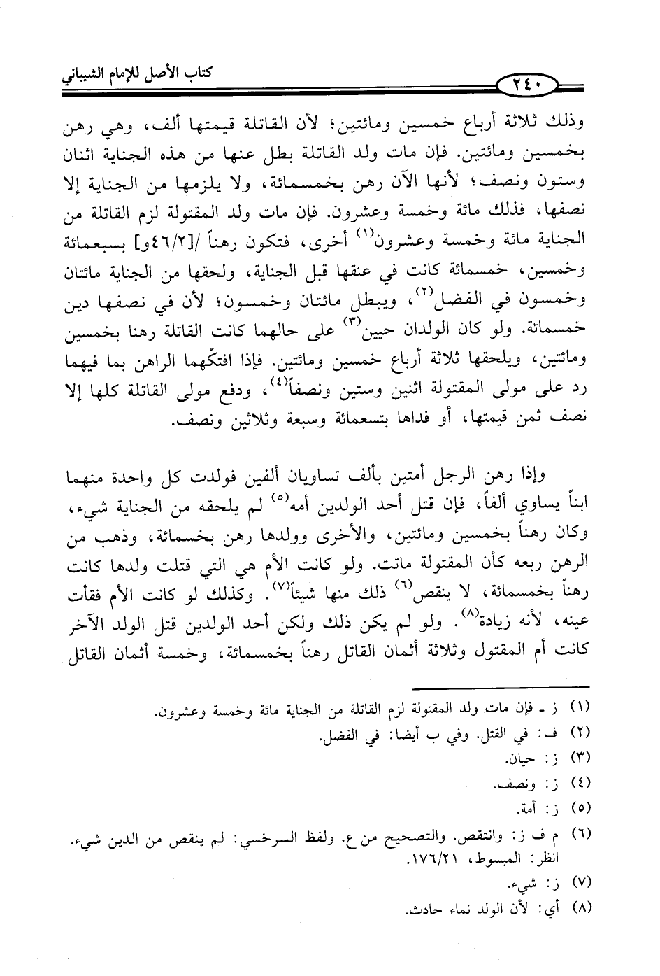 وإذا رهن الرجل أمتين بألف تساويان ألفين فولدت كل واحدة منهما ابناً يساوي ألفاً، فإن قتل أحد الولدين أمه (¬5) لم يلحقه من الجناية شيء، وكان رهناً بخمسين ومائتين، والأخرى وولدها رهن بخسمائة، وذهب من الرهن ربعه كأن المقتولة ماتت. ولو كانت الأم هي التي قتلت ولدها كانت رهناً بخمسمائة، لا ينقص (¬6) ذلك منها شيئاً (¬7). وكذلك لو كانت الأم فقأت عينه، لأنه زيادة (¬8). ولو لم يكن ذلك ولكن أحد الولدين قتل الولد الآخر كانت أم المقتول وثلاثة أثمان القاتل رهناً بخمسمائة، وخمسة أثمان القاتل