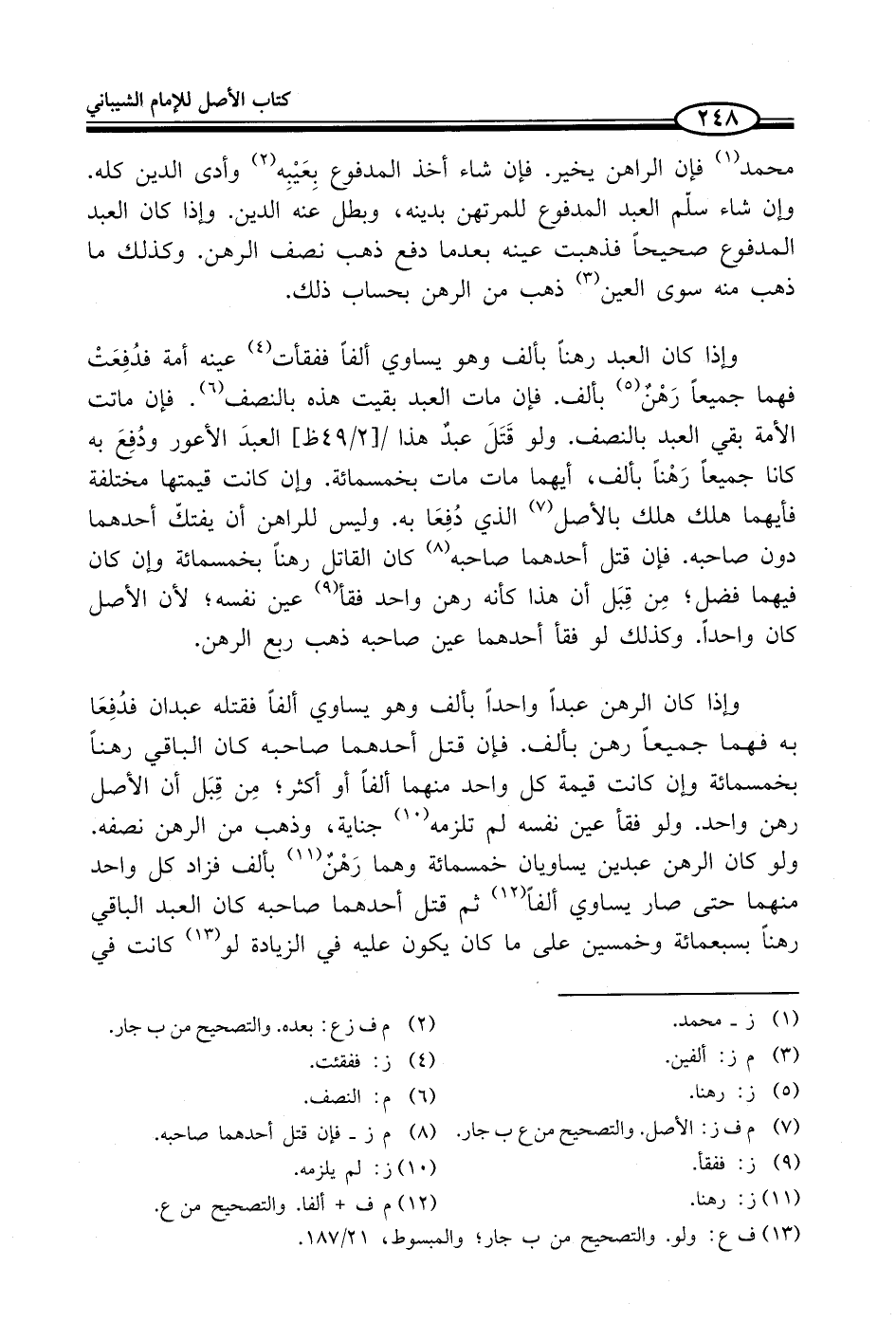 وإذا كان الرهن عبداً واحداً بألف وهو يساوي ألفاً فقتله عبدان فدُفِعَا به فهما جميعاً رهن بألف. فإن قتل أحدهما صاحبه كان الباقي رهناً بخمسمائة وإن كانت قيمة كل واحد منهما ألفاً أو أكثر؛ مِن قِبَل أن الأصل رهن واحد. ولو فقأ عين نفسه لم تلزمه (¬10) جناية، وذهب من الرهن نصفه. ولو كان الرهن عبدين يساويان خمسمائة وهما رَهْنٌ (¬11) بألف فزاد كل واحد منهما حتى صار يساوي ألفاً (¬12) ثم قتل أحدهما صاحبه كان العبد الباقي رهناً بسبعمائة وخمسين على ما كان يكون عليه في الزيادة لو (¬13) كانت في