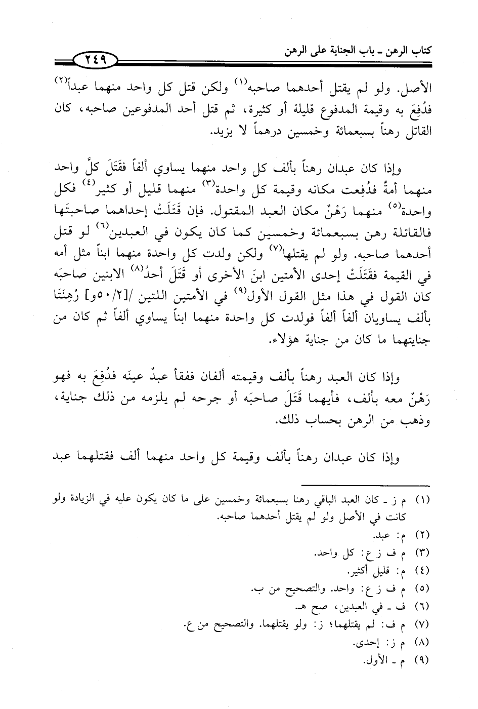 (¬1) م ز - كان العبد الباقي رهنا بسبعمائة وخمسين على ما كان يكون عليه في الزيادة ولو كانت في الأصل ولو لم يقتل أحدهما صاحبه.