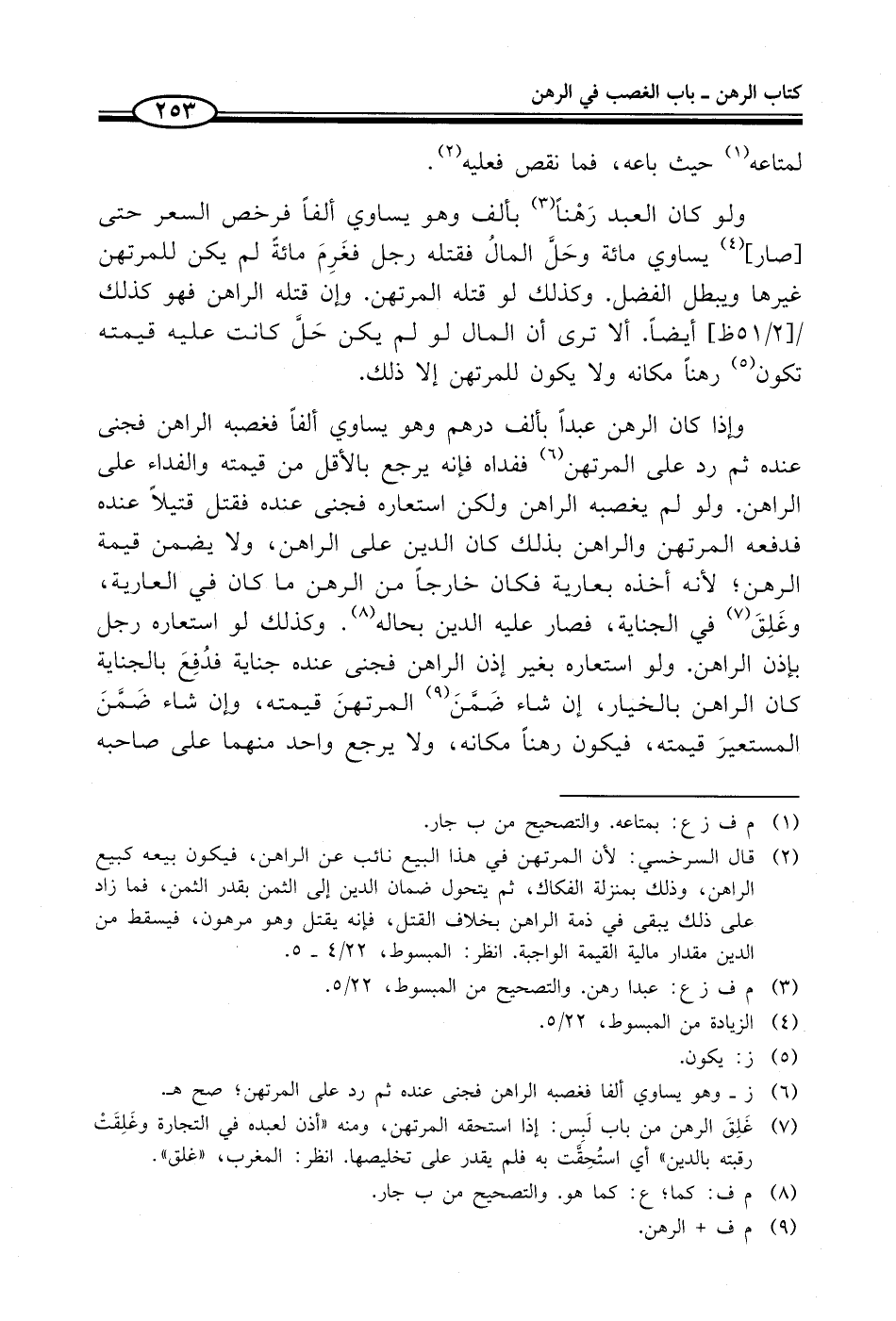 ولو كان العبد رَهْناً (¬3) بألف وهو يساوي ألفاً فرخص السعر حتى أصار، (¬4) يساوي مائة وحَلَّ المالُ فقتله رجل فغَرِمَ مائةً لم يكن للمرتهن غيرها ويبطل الفضل. وكذلك لو قتله المرتهن. وإن قتله الراهن فهو كذلك أيضاً. ألا ترى أن المال لو لم يكن حَلَّ كانت عليه قيمته تكون (¬5) رهناً مكانه ولا يكون للمرتهن إلا ذلك.