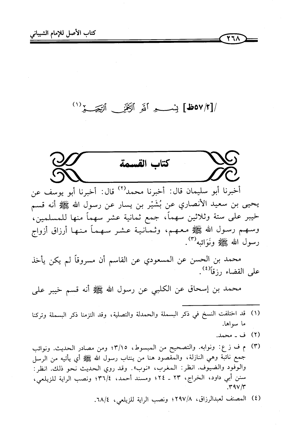 أخبرنا أبو سليمان قال: أخبرنا محمد (¬2) قال: أخبرنا أبو يوسف عن يحيى بن سعيد الأنصاري عن بُشَيْر بن يسار عن رسول الله - صلى الله عليه وسلم - أنه قسم خيبر على ستة وثلاثين سهماً، جمع ثمانية عشر سهماً منها للمسلمين، وسهم رسول الله - صلى الله عليه وسلم - معهم، وثمانية عشر سهماً منها أرزاق أزواج رسول الله - صلى الله عليه وسلم - ونَوَائبه (¬3).