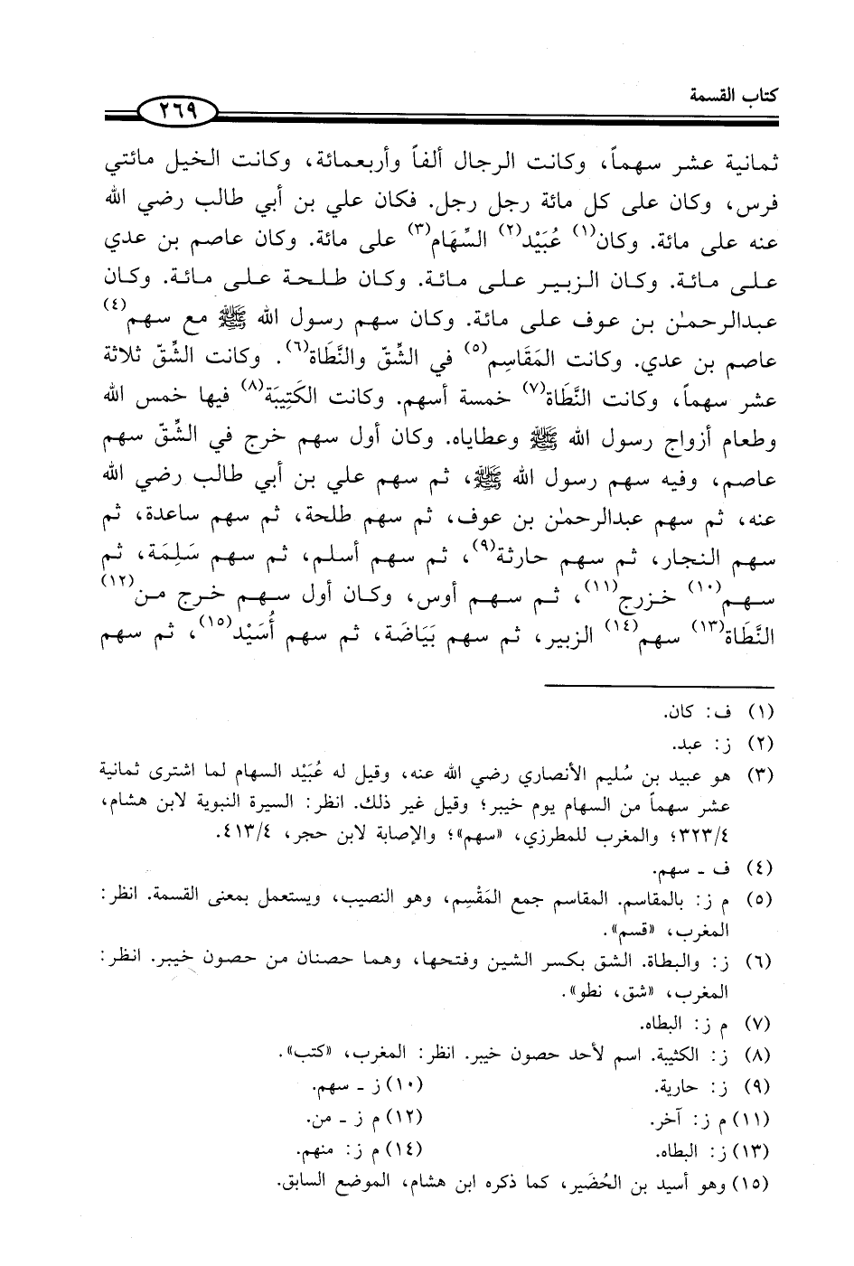 ثمانية عشر سهماً، وكانت الرجال ألفاً وأربعمائة، وكانت الخيل مائتي فرس، وكان على كل مائة رجل رجل. فكان علي بن أبي طالب رضي الله عنه على مائة. وكان (¬1) عُبَيْد (¬2) السِّهَام (¬3) على مائة. وكان عاصم بن عدي على مائة. وكان الزبير على مائة. وكان طلحة على مائة. وكان عبد الرحمن بن عوف على مائة. وكان سهم رسول الله - صلى الله عليه وسلم - مع سهم (¬4) عاصم بن عدي. وكانت المَقَاسِم (¬5) في الشِّقّ والنَّطَاة (¬6). وكانت الشِّقّ ثلاثة عشر سهماً، وكانت النَّطَاة (¬7) خمسة أسهم. وكانت الكَتِيبَة (¬8) فيها خمس الله وطعام أزواج رسول الله - صلى الله عليه وسلم - وعطاياه. وكان أول سهم خرج في الشِّقّ سهم عاصم، وفيه سهم رسول الله - صلى الله عليه وسلم -, ثم سهم علي بن أبي طالب - رضي الله عنه -, ثم سهم عبد الرحمن بن عوف، ثم سهم طلحة، ثم سهم ساعدة، ثم سهم النجار، ثم سهم حارثة (¬9)، ثم سهم أسلم، ثم سهم سَلِمَة، ثم سهم (¬10) خزرج (¬11)، ثم سهم أوس، وكان أول سهم خرج من (¬12) النَّطَاة (¬13) سهم (¬14) الزبير، ثم سهم بَيَاضَة، ثم سهم أسَيْد (¬15)، ثم سهم