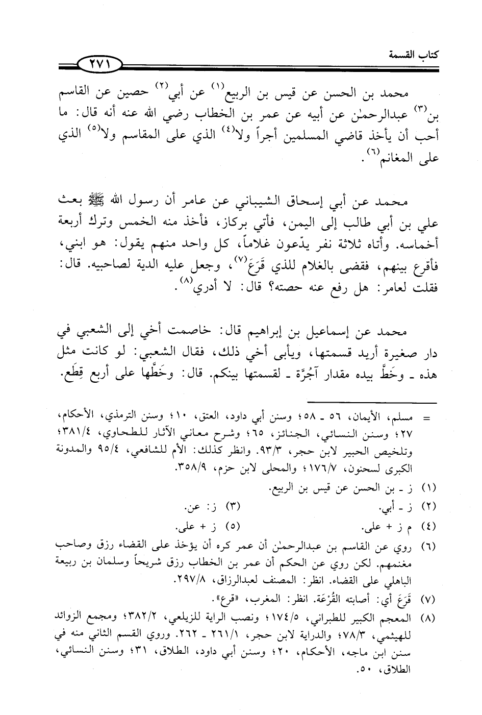محمد بن الحسن عن قيس بن الربيع (¬1) عن أبي (¬2) حصين عن القاسم بن (¬3) عبدالرحمن عن أبيه عن عمر بن الخطاب - رضي الله عنه - أنه قال: ما أحب أن يأخذ قاضي المسلمين أجراً ولا (¬4) الذي على المقاسم ولا (¬5) الذي على المغانم (¬6).