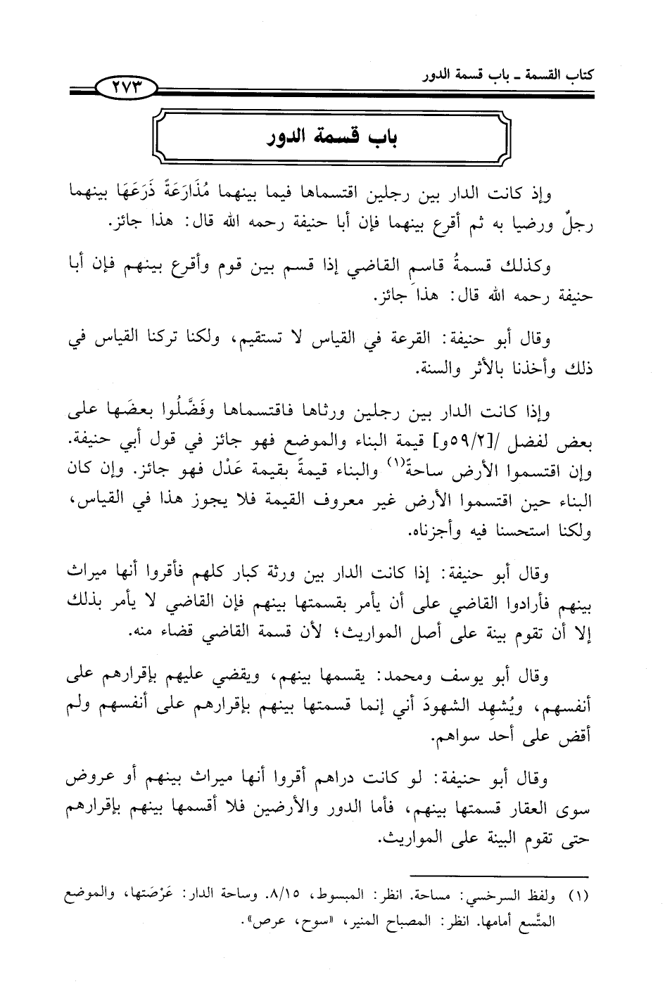 (¬1) ولفظ السرخسي: مساحة انظر: المبسوط، 15/ 8. وساحة الدار: عَرْصَتها، والموضع المتَّسع أمامها. انظر: المصباح المنير، "سوح، عرص".