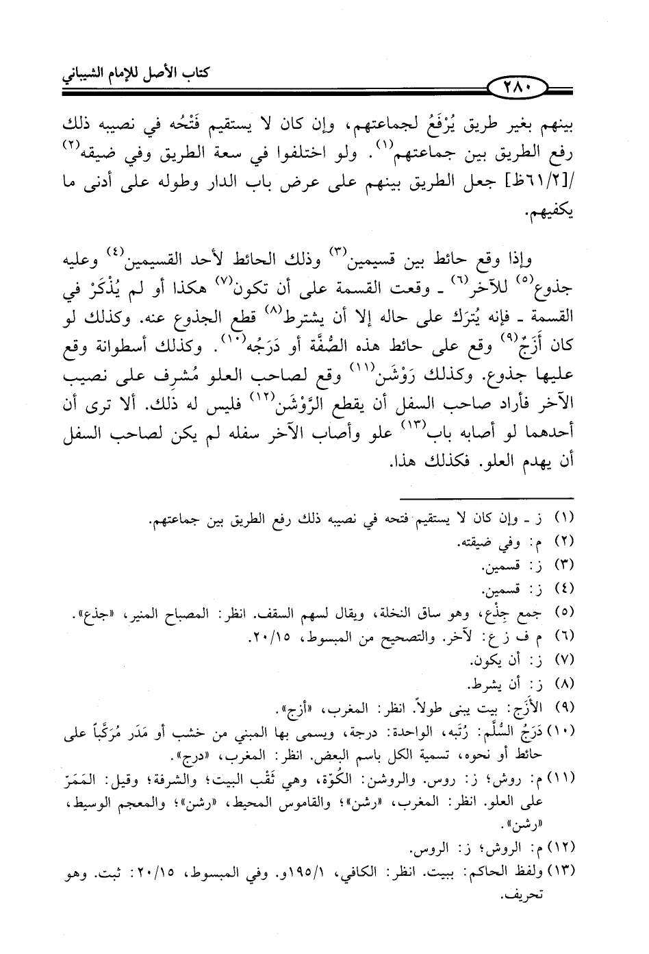 وإذا وقع حائط بين قسيمين (¬3) وذلك الحائط لأحد القسيمين (¬4) وعليه جذوع (¬5) للآخر (¬6) - وقعت القسمة على أن تكون (¬7) هكذا أو لم يُذْكَرْ في القسمة- فإنه يُترَك على حاله إلا أن يشترط (¬8) قطع الجذوع عنه. وكذلك لو كان أَزَجٌ (¬9) وقع على حائط هذه الصُّفَة أو دَرَجُه (¬10). وكذلك أسطوانة وقع عليها جذوع. وكذلك رَوْشَن (¬11) وقع لصاحب العلو مُشرِف علي نصيب الآخر فأراد صاحب السفل أن يقطع الرَّوْشَن (¬12) فليس له ذلك. ألا ترى أن أحدهما لو أصابه باب (¬13) علو وأصاب الآخر سفله لم يكن لصاحب السفل أن يهدم العلو. فكذلك هذا.