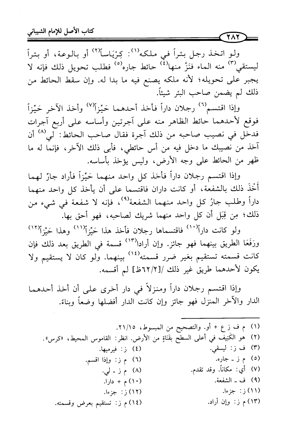 ولو كانت داراً (¬10) فاقتسماها رجلان فأخذ هذا حَيِّزاً (¬11) وهذا حَيِّزاً (¬12) ورَفَعَا الطريق بينهما فهو جائز. وإن أرادا (¬13) قسمة في الطريق بعد ذلك فإن كانت قسمته تستقيم بغير ضرر قسمته (¬14) بينهما. ولو كان لا يستقيم ولا يكون لأحدهما طريق غير ذلك لم أقسمه.