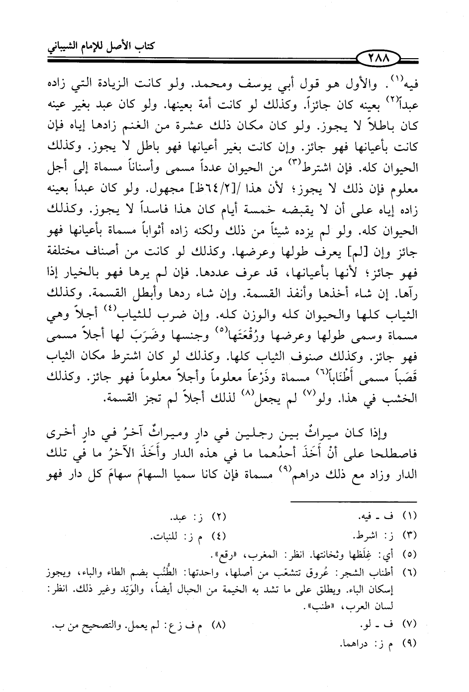 فيه (¬1). والأول هو قول أبي يوسف ومحمد. ولو كانت الزيادة التي زاده عبداً (¬2) بعينه كان جائزاً. وكذلك لو كانت أمة بعينها. ولو كان عبد بغير عينه كان باطلاً لا يجوز. ولو كان مكان ذلك عشرة من الغنم زادها إياه فإن كانت بأعيانها فهو جائز. وإن كانت بغير أعيانها فهو باطل لا يجوز. وكذلك الحيوان كله. فإن اشترط (¬3) من الحيوان عدداً مسمى وأسناناً مسماة إلى أجل معلوم فإن ذلك لا يجوز؛ لأن هذا مجهول. ولو كان عبداً بعينه زاده إياه على أن لا يقبضه خمسة أيام كان هذا فاسداً لا يجوز. وكذلك الحيوان كله. ولو لم يزده شيئاً من ذلك ولكنه زاده أثواباً مسماة بأعيانها فهو جائز وإن [لم] يعرف طولها وعرضها. وكذلك لو كانت من أصناف مختلفة فهو جائز؛ لأنها بأعيانها، قد عرف عددها. فإن لم يرها فهو بالخيار إذا رآها. إن شاء أخذها وأنفذ القسمة. وإن شاء ردها وأبطل القسمة. وكذلك الثياب كلها والحيوان كله والوزن كله. وإن ضرب للثياب (¬4) أجلاً وهي مسماة وسمى طولها وعرضها ورُقْعَتَها (¬5) وجنسها وضَرَبَ لها أجلاً مسمى فهو جائز. وكذلك صنوف الثياب كلها. وكذلك لو كان اشترط مكان الثياب قَصَباً مسمى أَطْنَاباً (¬6) مسماة وذَرْعاً معلوماً وأجلاً معلوماً فهو جائز. وكذلك الخشب في هذا. ولو (¬7) لم يجعل (¬8) لذلك أجلاً لم تجز القسمة.
