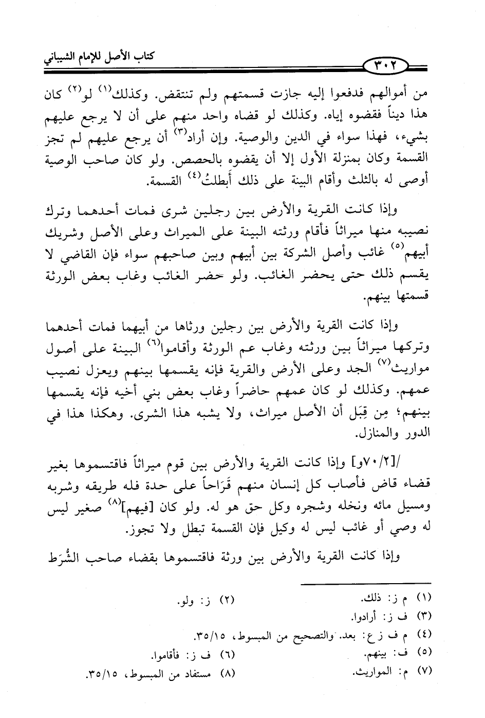 وإذا كانت القرية والأرض بين رجلين ورثاها من أبيهما فمات أحدهما وتركها ميراثاً بين ورثته وغاب عم الورثة وأقاموا (¬6) البينة على أصول مواريث (¬7) الجد وعلى الأرض والقرية فإنه يقسمها بينهم ويعزل نصيب عمهم. وكذلك لو كان عمهم حاضراً وغاب بعض بني أخيه فإنه يقسمها بينهم؛ مِن قِبَل أن الأصل ميراث، ولا يشبه هذا الشرى. وهكذا هذا في الدور والمنازل.