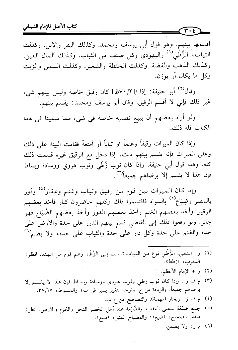 (¬3) م ف ز - وإذا كان ثوب زطي وثوب هروي ووسادة وبساط فإن هذا لا يقسم إلا برضاهم جميعاً. والزيادة من ع. وتوجد بتغيير يسير في ب؛ والمبسوط، 15/ 37.
