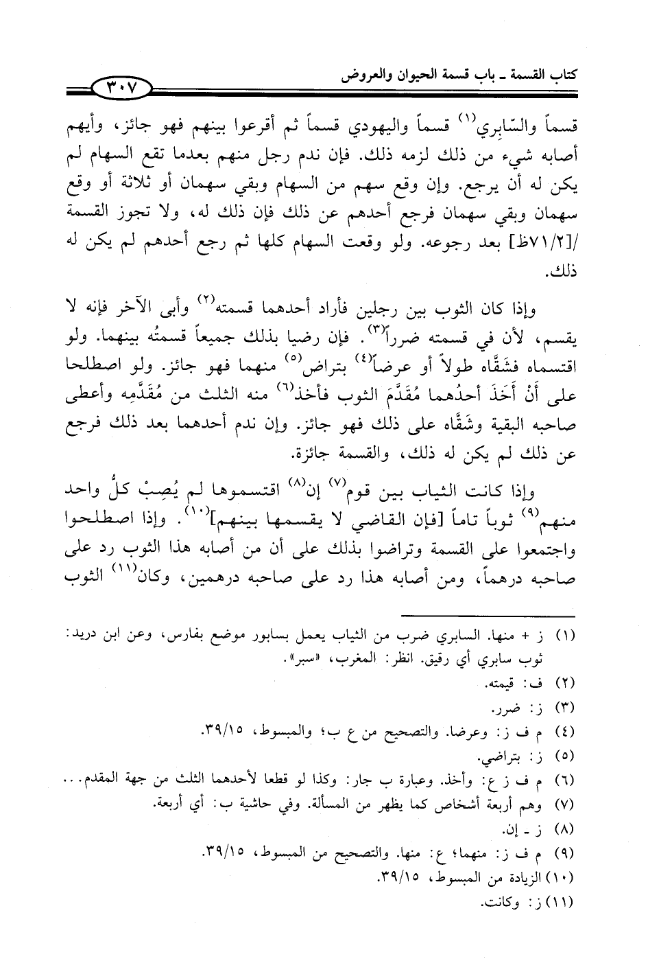 قسماً والسّابِري (¬1) قسماً واليهودي قسماً ثم أقرعوا بينهم فهو جائز، وأيهم أصابه شيء من ذلك لزمه ذلك. فإن ندم رجل منهم بعدما تقع السهام لم يكن له أن يرجع. وإن وقع سهم من السهام وبقي سهمان أو ثلاثة أو وقع سهمان وبقي سهمان فرجع أحدهم عن ذلك فإن ذلك له، ولا تجوز القسمة بعد رجوعه. ولو وقعت السهام كلها ثم رجع أحدهم لم يكن له ذلك.