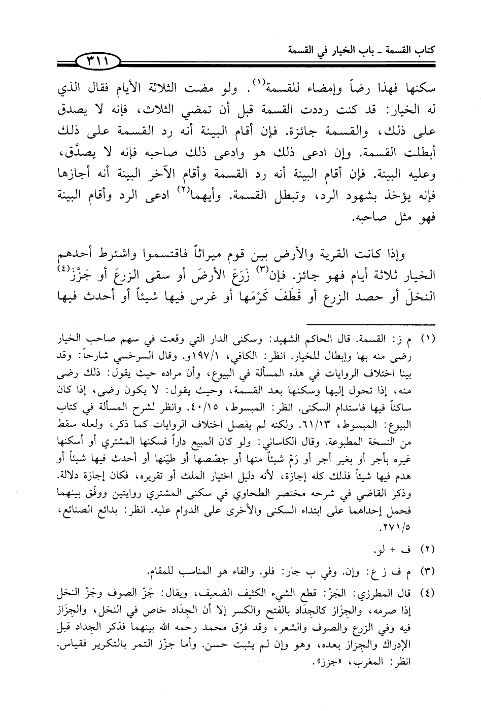 وإذا كانت القرية والأرض بين قوم ميراثاً فاقتسموا واشترط أحدهم الخيار ثلاثة أيام فهو جائز. فإن (¬3) زَرَعَ الأرضَ أو سقى الزرعَ أو جَزَّزَ (¬4) النخلَ أو حصد الزرع أو قَطَفَ كَرْمَها أو غرس فيها شيئاً أو أحدث فيها