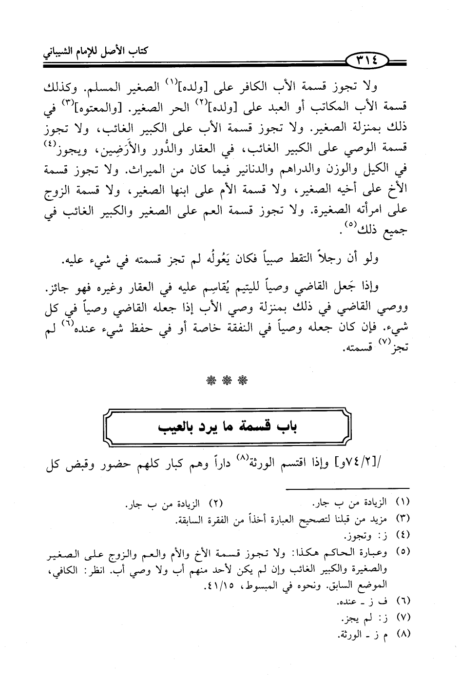 (¬5) وعبارة الحاكم هكذا: ولا تجوز قسمة الأخ والأم والعم والزوج على الصغير والصغيرة والكبير الغائب وإن لم يكن لأحد منهم أب ولا وصي أب. انظر: الكافي، الموضع السابق. ونحوه في المبسوط، 15/ 41.