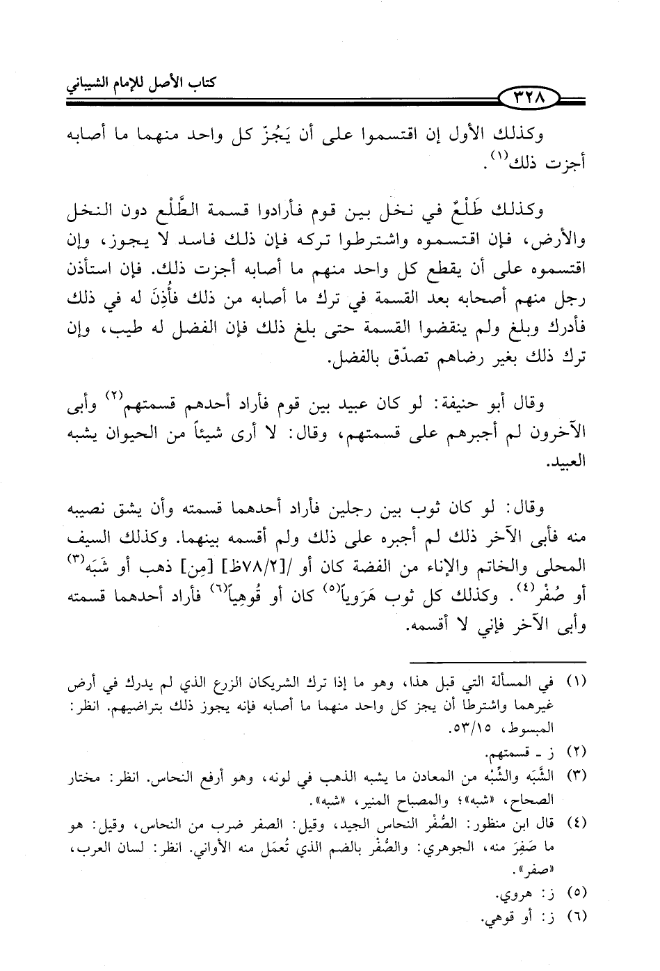 وقال: لو كان ثوب بين رجلين فأراد أحدهما قسمته وأن يشق نصيبه منه فأبى الآخر ذلك لم أجبره على ذلك ولم أقسمه بينهما. وكذلك السيف المحلى والخاتم والإناء من الفضة كان أو [مِن] ذهب أو شَبَه (¬3) أو صُفْر (¬4). وكذلك كل ثوب هَرَوياً (¬5) كان أو قُوهِياً (¬6) فأراد أحدهما قسمته وأبى الآخر فإني لا أقسمه.
