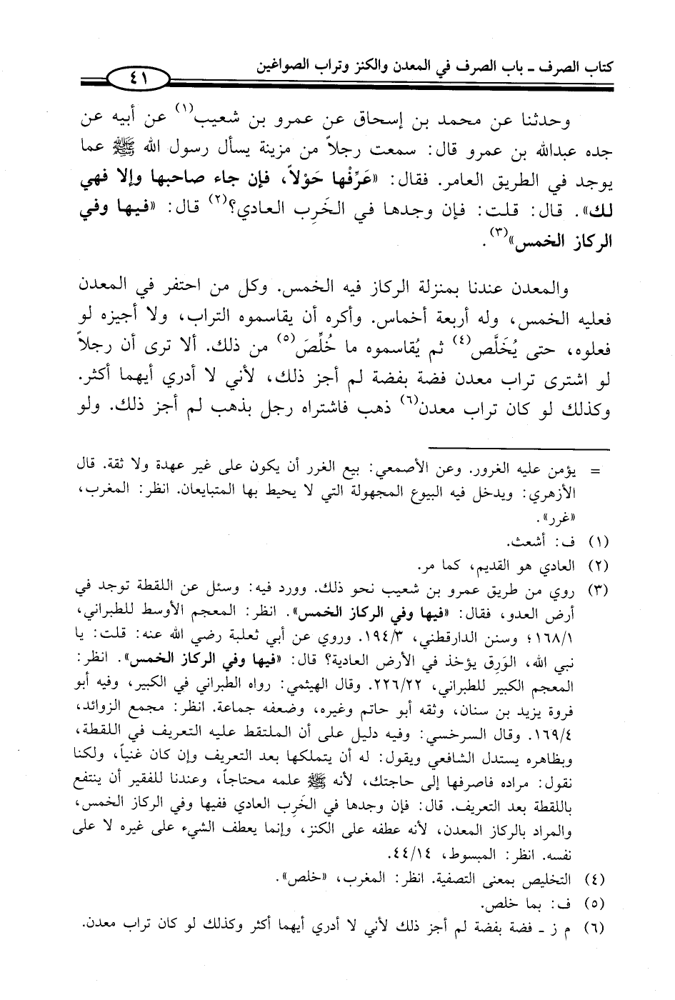 (¬3) روي من طريق عمرو بن شعيب نحو ذلك. وورد فيه: وسئل عن اللقطة توجد في أرض العدو، فقال: "فيها وفي الركاز الخمس". انظر: المعجم الأوسط للطبراني، 1/ 168؛ وسنن الدارقطني، 3/ 194. وروي عن أبي ثعلبة - رضي الله عنه -: قلت: يا نبي الله، الوَرِق يؤخذ في الأرض العادية؟ قال: "فيها وفي الركاز الخمس". انظر: المعجم الكبير للطبراني، 22/ 226. وقال الهيثمي: رواه الطبراني في الكبير، وفيه أبو فروة يزيد بن سنان، وثقه أبو حاتم وغيره، وضعفه جماعة. انظر: مجمع الزوائد، 4/ 169. وقال السرخسي: وفيه دليل على أن الملتقط عليه التعريف في اللقطة، وبظاهره يستدل الشافعي ويقول: له أن يتملكها بعد التعريف وإن كان غنياً، ولكنا نقول: مراده فاصرفها إلى حاجتك، لأنه - صلى الله عليه وسلم - علمه محتاجاً، وعندنا للفقير أن ينتفع باللقطة بعد التعريف. قال: فإن وجدها في الخَرِب العادي ففيها وفي الركاز الخمس، والمراد بالركاز المعدن، لأنه عطفه على الكنز، وإنما يعطف الشيء على غيره لا على نفسه. انظر: المبسوط، 14/ 44.