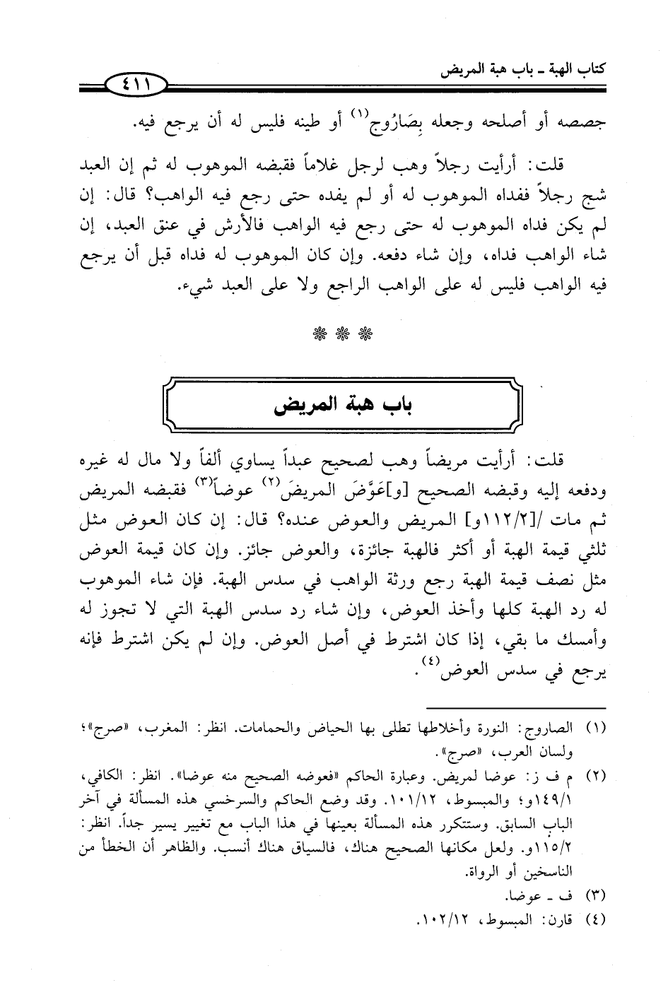 (¬2) م ف ز: عوضا لمريض. وعبارة الحاكم "فعوضه الصحيح منه عوضا". انظر: الكافي، 1/ 49 و؛ والمبسوط، 12/ 101. وقد وضع الحاكم والسرخسي هذه المسألة في آخر الباب السابق. وستتكرر هذه المسألة بعينها في هذا الباب مع تغيير يسير جداً. انظر: 2/ 115 و. ولعل مكانها الصحيح هناك، فالسياق هناك أنسب. والظاهر أن الخطأ من الناسخين أو الرواة.