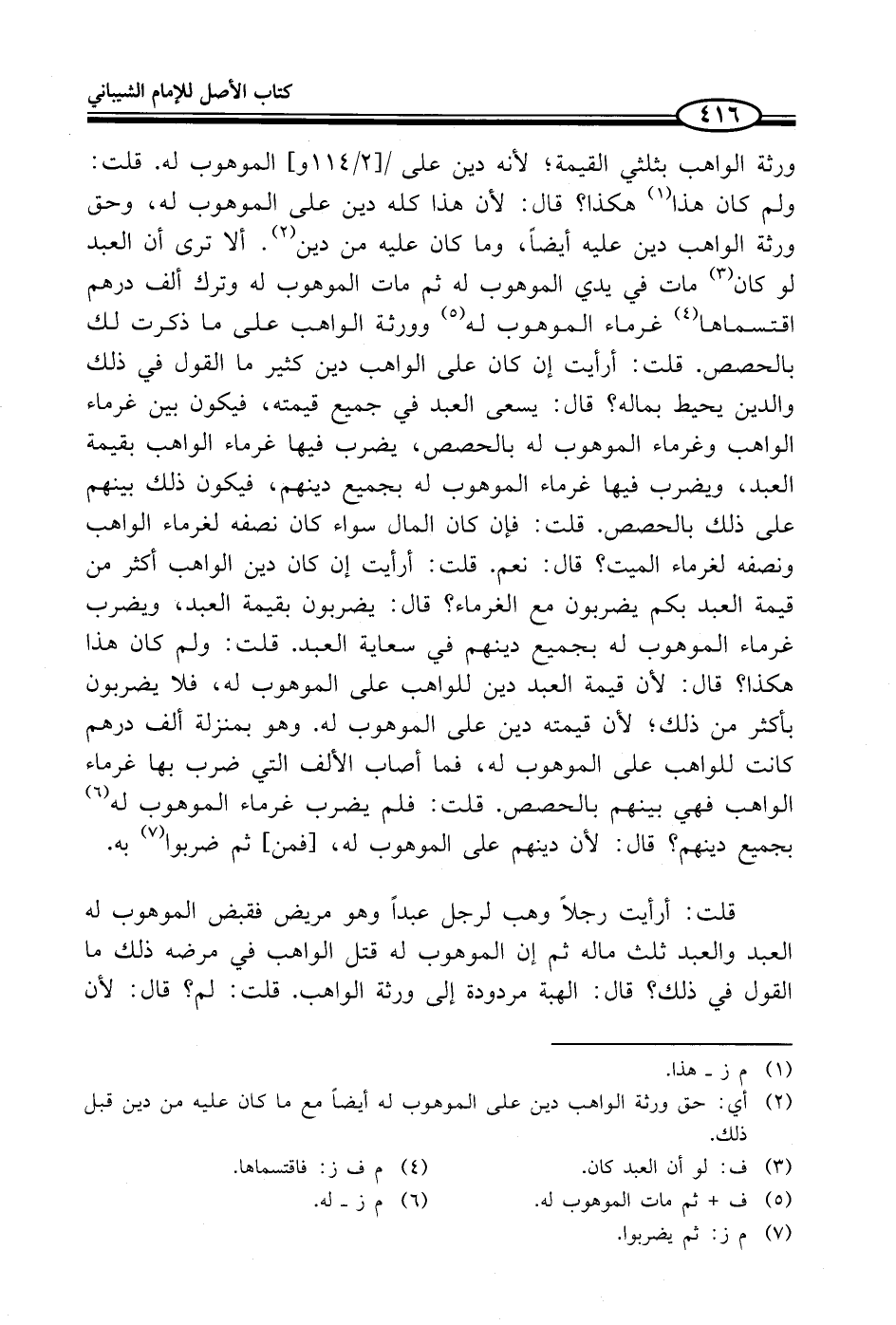 ورثة الواهب بثلثي القيمة؛ لأنه دين على الموهوب له. قلت: ولم كان هذا (¬1) هكذا؟ قال: لأن هذا كله دين على الموهوب له، وحق ورثة الواهب دين عليه أيضاً، وما كان عليه من دين (¬2). ألا ترى أن العبد لو كان (¬3) مات في يدي الموهوب له ثم مات الموهوب له وترك ألف درهم اقتسماها (¬4) غرماء الموهوب له (¬5) وورثة الواهب على ما ذكرت لك بالحصص. قلت: أرأيت إن كان على الواهب دين كثير ما القول في ذلك والدين يحيط بماله؟ قال: يسعى العبد في جميع قيمته، فيكون بين غرماء الواهب وغرماء الموهوب له بالحصص، يضرب فيها غرماء الواهب بقيمة العبد، ويضرب فيها غرماء الموهوب له بجميع دينهم، فيكون ذلك بينهم على ذلك بالحصص. قلت: فإن كان المال سواء كان نصفه لغرماء الواهب ونصفه لغرماء الميت؟ قال: نعم. قلت: أرأيت إن كان دين الواهب أكثر من قيمة العبد بكم يضربون مع الغرماء؟ قال: يضربون بقيمة العبد، ويضرب غرماء الموهوب له بجميع دينهم في سعاية العبد. قلت: ولم كان هذا هكذا؟ قال: لأن قيمة العبد دين للواهب على الموهوب له، فلا يضربون بأكثر من ذلك؛ لأن قيمته دين على الموهوب له. وهو بمنزلة ألف درهم كانت للواهب على الموهوب له، فما أصاب الألف التي ضرب بها غرماء الواهب فهي بينهم بالحصص. قلت: فلم يضرب غرماء الموهوب له (¬6) بجميع دينهم؟ قال: لأن دينهم على الموهوب له، [فمن] ثم ضربوا (¬7) به.