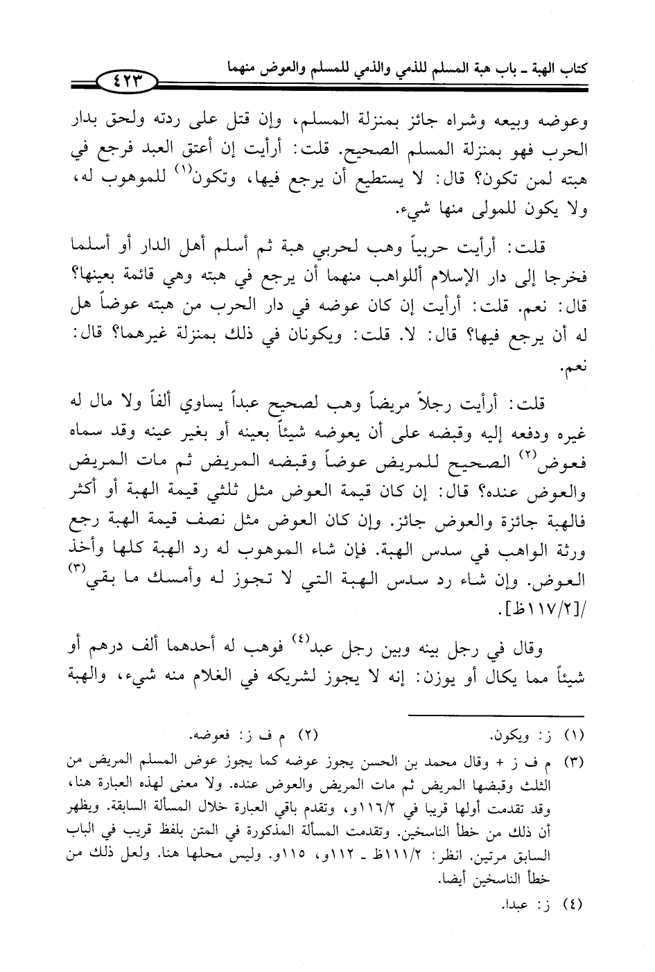 (¬3) م ف ز + وقال محمد بن الحسن يجوز عوضه كما يجوز عوض المسلم المريض من الثلث وقبضها المريض ثم مات المريض والعوض عنده. ولا معنى لهذه العبارة هنا، وقد تقدمت أولها قريبا في 2/ 116 و، وتقدم باقي العبارة خلال المسألة السابقة. ويظهر أن ذلك من خطأ الناسخين. وتقدمت المسألة المذكورة في المتن بلفظ قريب في الباب السابق مرتين. انظر: 2/ 111 ظ - 112 و، 115 و. وليس محلها هنا. ولعل ذلك من خطأ الناسخين أيضا.