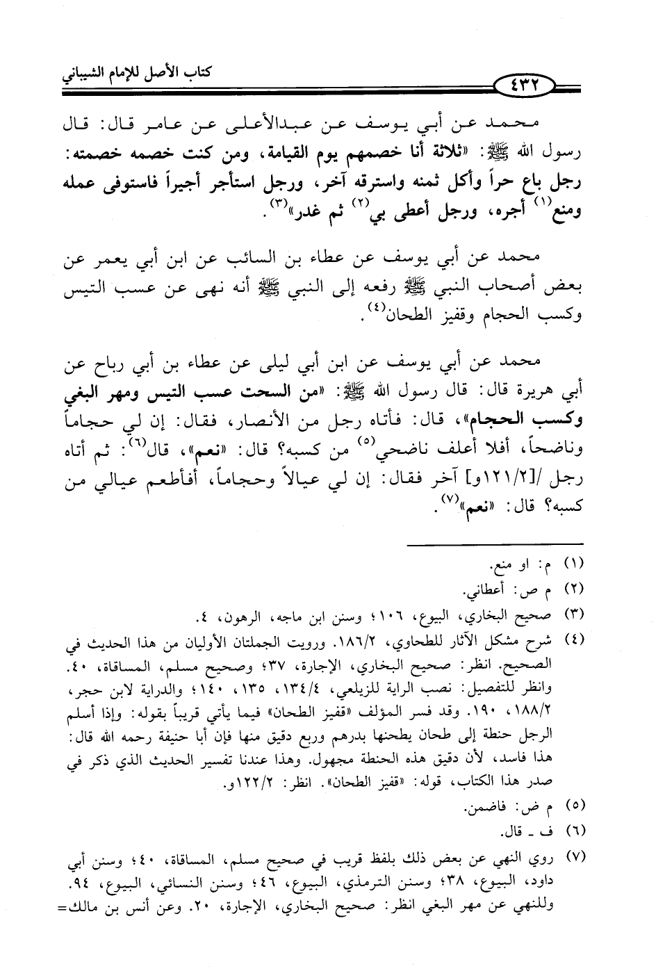 محمد عن أبي يوسف عن ابن أبي ليلى عن عطاء بن أبي رباح عن أبي هريرة قال: قال رسول الله - صلى الله عليه وسلم -: "من السحت عسب التيس ومهر البغي وكسب الحجام"، قال: فأتاه رجل من الأنصار، فقال: إن لي حجاماً وناضحاً، أفلا أعلف ناضحي (¬5) من كسبه؟ قال: "نعم"، قال (¬6): ثم أتاه رجل آخر فقال: إن لي عيالاً وحجاماً، أفأطعم عيالي من كسبه؟ قال: "نعم" (¬7).