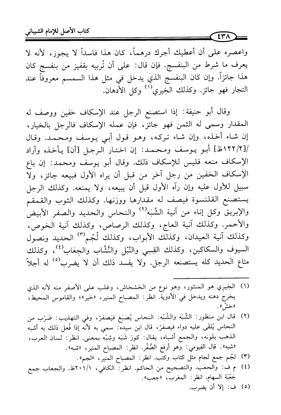 وقال أبو حنيفه: إذا استصنع الرجل عند الإسكاف خفين ووصف له المقدار وسمى له الثمن فهو جائز، فإن عمله الإسكاف فالرجل بالخيار، إن شاء أخذه، وإن شاء تركه، وهو قول أبي يوسف ومحمد. وقال أبو يوسف ومحمد: إن اختار الرجل [أن] يأخذه وأراد الإسكاف منعه فليس للإسكاف ذلك. وقال أبو يوسف ومحمد: إن باع الإسكاف الخفين من رجل آخر من قبل أن يراه الأول فبيعه جائز، ولا سبيل للأول عليه وإن رآه الأول قبل أن يبيعه، ولا يمنعه. وكذلك الرجل يستصنع القلنسوة فيصف له مقدارها ووزنها. وكذلك الثوب والقمقم والإبريق وكل إناء من آنية الشَّبَه (¬2) والنحاس والحديد والصفر الأبيض والأحفر. وكذلك آنية العاج، وكذلك الرصاص، وكذلك آنية الخوص، وكذلك آنية العيدان، وكذلك الأبواب، وكذلك لُجُم (¬3) الحديد ونصول السيوف والسكاكين، وكذلك القِسِي والنَّبْل والنُّشَّاب والجِعَاب (¬4)، وكذلك متاع الحديد كله يستصنعه الرجل. ولا يفسد ذلك أن لا يضرب (¬5) له أجلاً