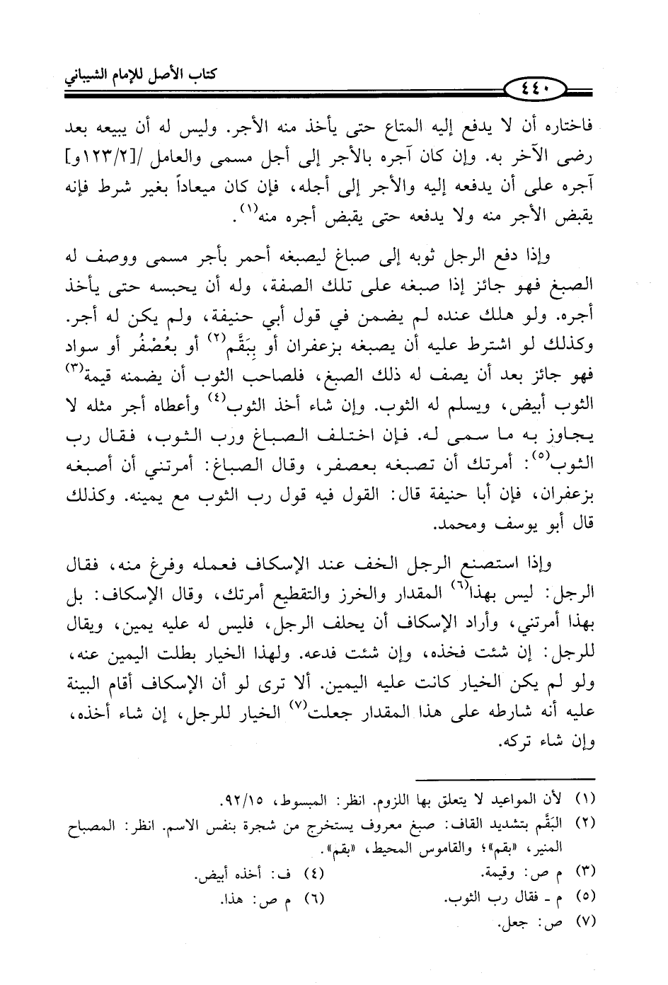 وإذا دفع الرجل ثوبه إلى صباغ ليصبغه أحمر بأجر مسمى ووصف له الصبغ فهو جائز إذا صبغه على تلك الصفة، وله أن يحبسه حتى يأخذ أجره. ولو هلك عنده لم يضمن في قول أبي حنيفة، ولم يكن له أجر. وكذلك لو اشترط عليه أن يصبغه بزعفران أو بِبَقَّم (¬2) أو بعُصْفُر أو سواد فهو جائز بعد أن يصف له ذلك الصبغ، فلصاحب الثوب أن يضمنه قيمة (¬3) الثوب أبيض، ويسلم له الثوب. وأن شاء أخذ الثوب (¬4) وأعطاه أجر مثله لا يجاوز به ما سمى له. فإن اختلف الصباغ ورب الثوب، فقال رب الثوب (¬5): أمرتك أن تصبغه بعصفر، وقال الصباغ: أمرتني أن أصبغه بزعفران، فإن أبا حنيفة قال: القول فيه قول رب الثوب مع يمينه. وكذلك قال أبو يوسف ومحمد.