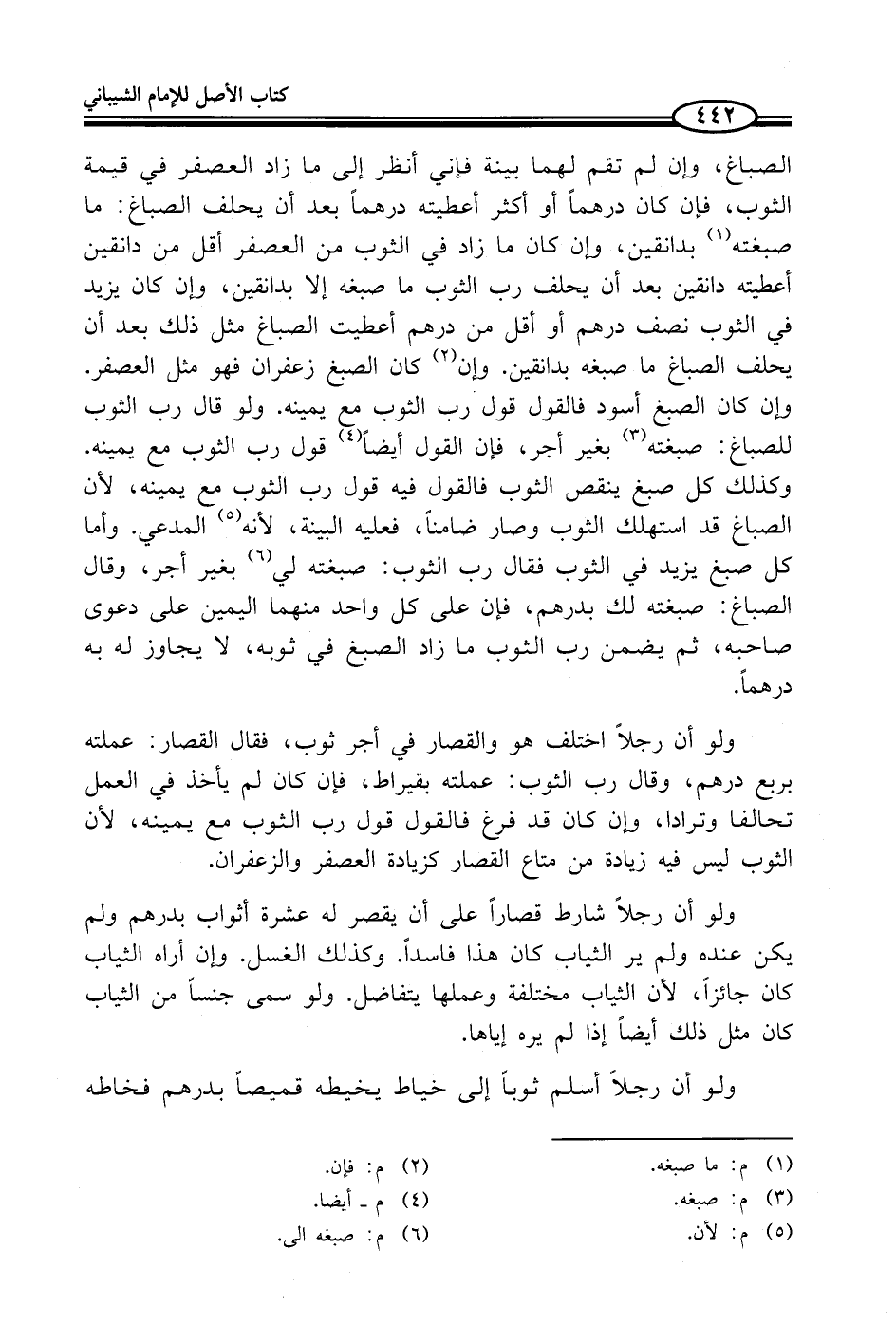الصباغ، وإن لم تقم لهما بينة فإني أنظر إلى ما زاد العصفر في قيمة الثوب، فإن كان درهماً أو أكثر أعطيته درهماً بعد أن يحلف الصباغ: ما صبغته (¬1) بدانقين، وإن كان ما زاد في الثوب من العصفر أقل من دانقين أعطيته دانقين بعد أن يحلف رب الثوب ما صبغه إلا بدانقين، وإن كان يزيد في الثوب نصف درهم أو أقل من درهم أعطيت الصباغ مثل ذلك بعد أن يحلف الصباغ ما صبغه بدانقين. وإن (¬2) كان الصبغ زعفران فهو مثل العصفر. وإن كان الصبغ أسود فالقول قول رب الثوب مع يمينه. ولو قال رب الثوب للصباغ: صبغته (¬3) بغير أجر، فإن القول أيضاً (¬4) قول رب الثوب مع يمينه. وكذلك كل صبغ ينقص الثوب فالقول فيه قول رب الثوب مع يمينه، لأن الصباغ قد استهلك الثوب وصار ضامناً، فعليه البينة، لأنه (¬5) المدعي. وأما كل صبغ يزيد في الثوب فقال رب الثوب: صبغته في (¬6) بغير أجر، وقال الصباغ: صبغته لك بدرهم، فإن على كل واحد منهما اليمين على دعوى صاحبه، ثم يضمن رب الثوب ما زاد الصبغ في ثوبه، لا يجاوز له به درهماً.