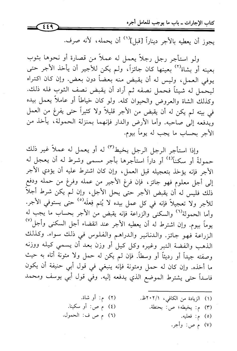 وإذا استأجر الرجل الرجل يخيط (¬3) له أو يعمل له عملاً غير ذلك حمولة أو سكناً (¬4) أو داراً استأجرها بأجر مسمى وشرط له أن يعجل له الأجر فإنه يؤخذ بتعجيله قبل العمل، وإن كان اشترط عليه أن يؤدي الأجر إلى أجل معلوم فهو جائز، فإن فرغ الأجير من عمله وفرغ من حمله ودفع ذلك فليس له أن يقبض الأجر حتى يحل الأجل، كان لم يكن شرط أجلاً للأجر ولا تعجيلاً فإنه في كل عمل بيده لا يُتم فِعلَه (¬5) حتى يستوفي الأجر. وأما الحمولة (¬6) والسكنى والزراعة فإنه يقبض من الأجر بحساب ما يجب له يوماً بيوم. وإن اشترط له أن يعطيه الأجر عند انقضاء أجل السكنى وأجل (¬7) الزراعة فهو جائز. والدنانير والدراهم والفلوس في ذلك سواء. وكذلك الذهب والفضة التبر وغيره وكل كيل أو وزن بعد أن يسمي كيله ووزنه وصفته جيداً أو رديئاً أو وسطاً. فإن لم يكن له حمل ولا مئونة أتاه به حيث ما أخذه. وإن كان له حمل ومئونة فإنه ينبغي في قول أبي حنيفة أن يكون فاسداً حتى يشترط الموضع الذي يدفعه إليه. وفي قول أبي يوسف ومحمد