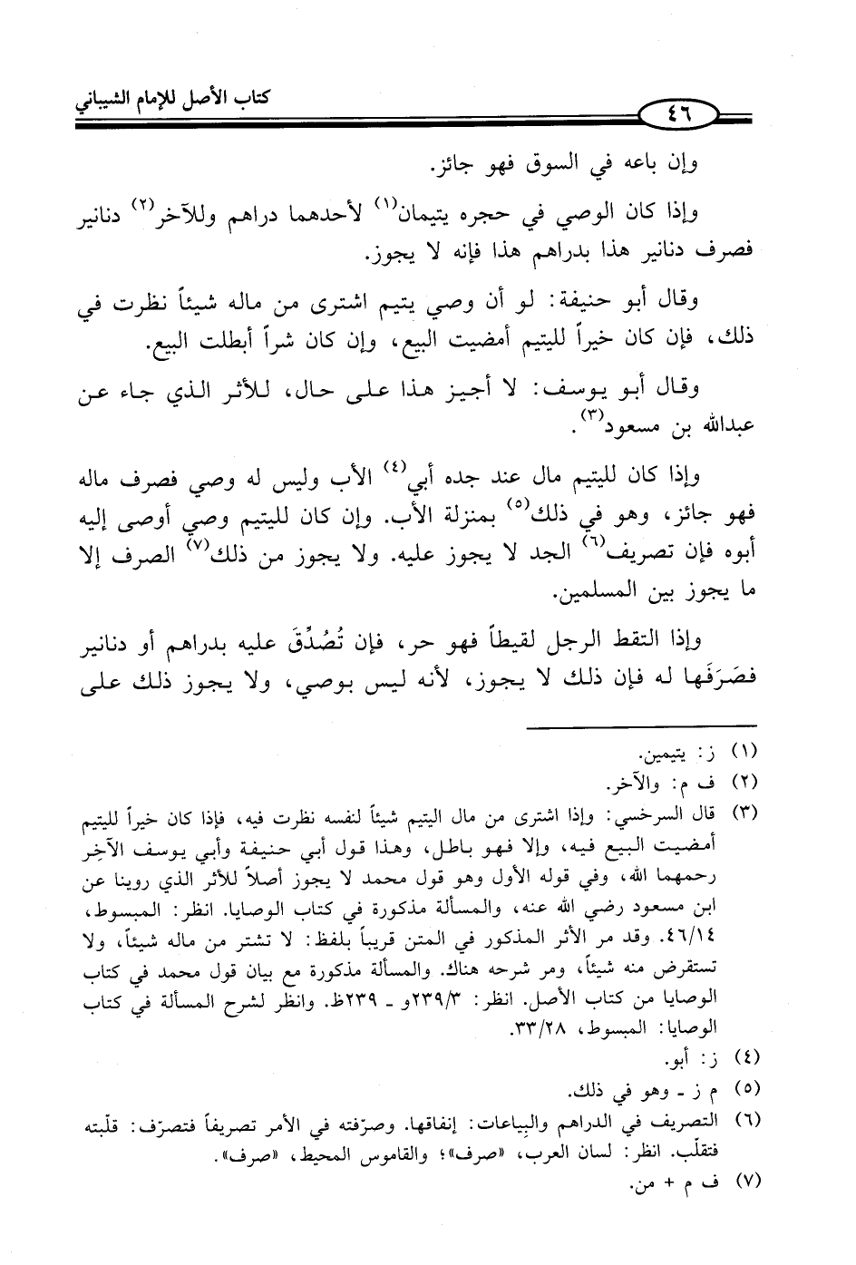 (¬3) قال السرخسي: وإذا اشترى من مال اليتيم شيئاً لنفسه نظرت فيه، فإذا كان خيراً لليتيم أمضيت البيع فيه، وإلا فهو باطل، وهذا قول أبي حنيفة وأبي يوسف الآخِر -رحمهما الله-، وفي قوله الأول وهو قول محمد لا يجوز أصلاً للأثر الذي روينا عن ابن مسعود - رضي الله عنه -، والمسألة مذكورة في كتاب الوصايا. انظر: المبسوط، 14/ 46. وقد مر الأثر المذكور في المتن قريباً بلفظ: لا تشتر من ماله شيئاً، ولا تستقرض منه شيئاً، ومر شرحه هناك. والمسألة مذكورة مع بيان قول محمد في كتاب الوصايا من كتاب الأصل. انظر: 3/ 239 و - 239 ظ. وانظر لشرح المسألة في كتاب الوصايا: المبسوط، 28/ 33.