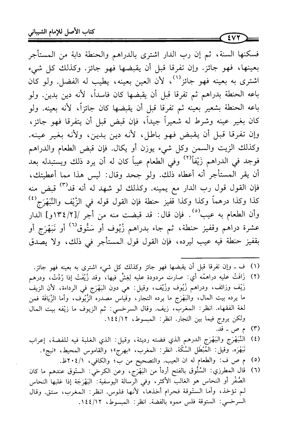 فسكنها السنة، ثم إن رب الدار اشترى بالدراهم والحنطة دابة من المستأجر بعينها، فهو جائز. وإن تفرقا قبل أن يقبضها فهو جائز. وكذلك كل شيء اشترى به بعينه فهو جائز (¬1)، لأن العين بعينه، يطيب له الفضل. ولو كان باعه الحنطة بدراهم ثم تفرقا قبل أن يقبضها كان فاسداً، لأنه دين بدين. ولو باعه الحنطة بشعير بعينه ثم تفرقا قبل أن يقبضها كان جائزاً، لأنه بعينه. ولو كان بغير عينه وشرط له شعيراً جيداً، فإن قبض قبل أن يتفرقا فهو جائز، وإن تفرقا قبل أن يقبض فهو باطل، لأنه دين بدين، ولأنه بغير عينه. وكذلك الزيت والسمن وكل شيء يوزن أو يكال. فإن قبض الطعام والدراهم فوجد في الدراهم زَيْفاً (¬2) وفي الطعام عيباً كان له أن يرد ذلك ويستبدله بعد أن يقر المستأجر أنه أعطاه ذلك. ولو جحد وقال: ليس هذا مما أعطيتك، فإن القول قول رب الدار مع يمينه. وكذلك لو شهد له أنه قد (¬3) قبض منه كذا وكذا درهماً وكذا وكذا قفيز حنطة فإن القول قوله في الزَّيْف والنَّبَهْرَج (¬4) وأن الطعام به عيب (¬5). فإن قال: قد قبضت منه من أجر الدار عشرة دراهم وقفيز حنطة، ثم جاء بدراهم زُيُوف أو سَتُّوق (¬6) أو نَبَهْرَج أو بقفيز حنطة فيه عيب ليرده، فإن القول قول المستأجر في ذلك، ولا يصدق