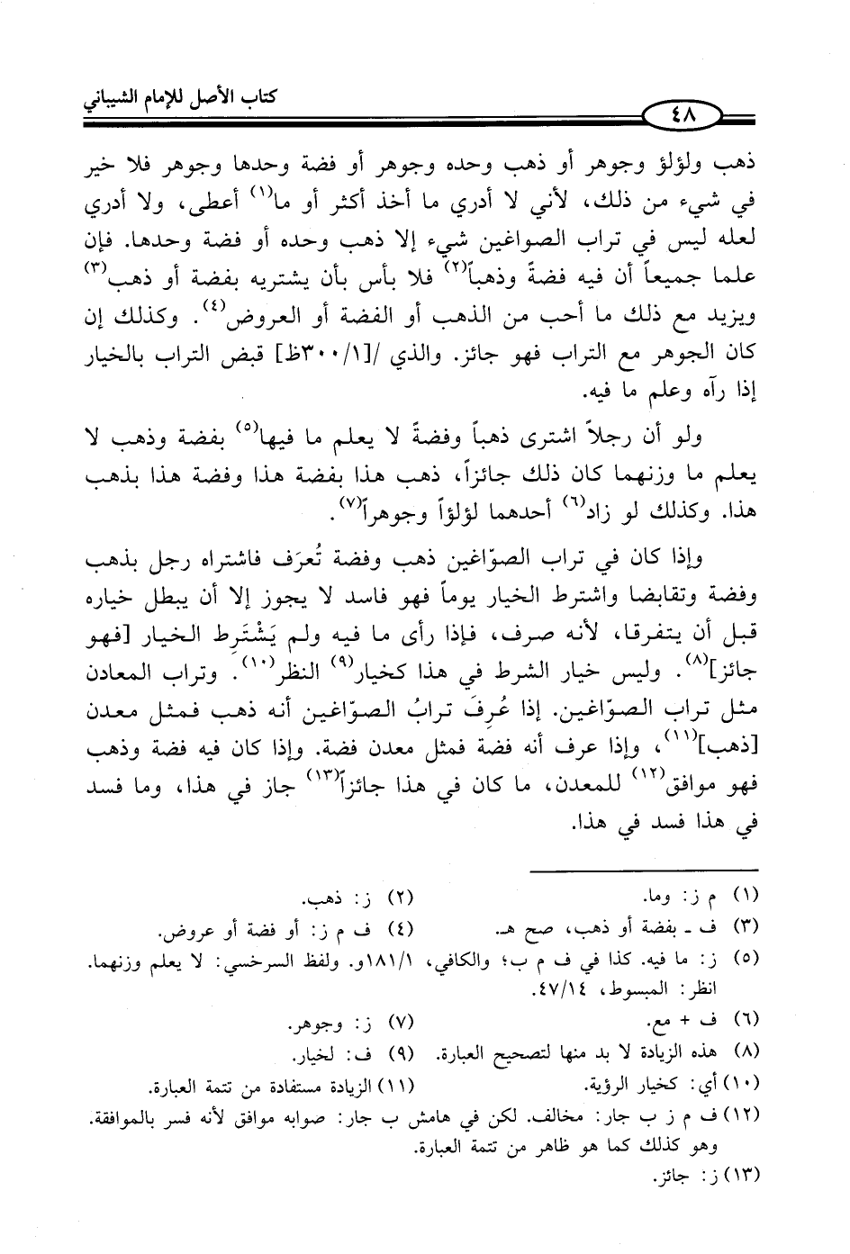 وإذا كان في تراب الصوّاغين ذهب وفضة تُعرَف فاشتراه رجل بذهب وفضة وتقابضا واشترط الخيار يوماً فهو فاسد لا يجوز إلا أن يبطل خياره قبل أن يتفرقا، لأنه صرف، فإذا رأى ما فيه ولم يَشْتَرِط الخيار [فهو جائز] (¬8). وليس خيار الشرط في هذا كخيار (¬9) النظر (¬10). وتراب المعادن مثل تراب الصوّاغين. إذا عُرِفَ ترابُ الصوّاغين أنه ذهب فمثل معدن [ذهب] (¬11)، وإذا عرف أنه فضة فمثل معدن فضة. وإذا كان فيه فضة وذهب فهو موافق (¬12) للمعدن، ما كان في هذا جائزاً (¬13) جاز في هذا، وما فسد في هذا فسد في هذا.