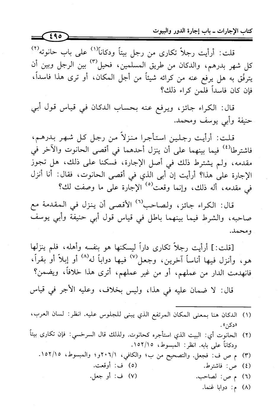 (¬2) الحانوت أي: البيت الذي استأجره كحانوت. ولذلك قال السرخسي: فإن تكارى بيتاً ودكاناً على بابه. انظر: المبسوط، 15/ 152.