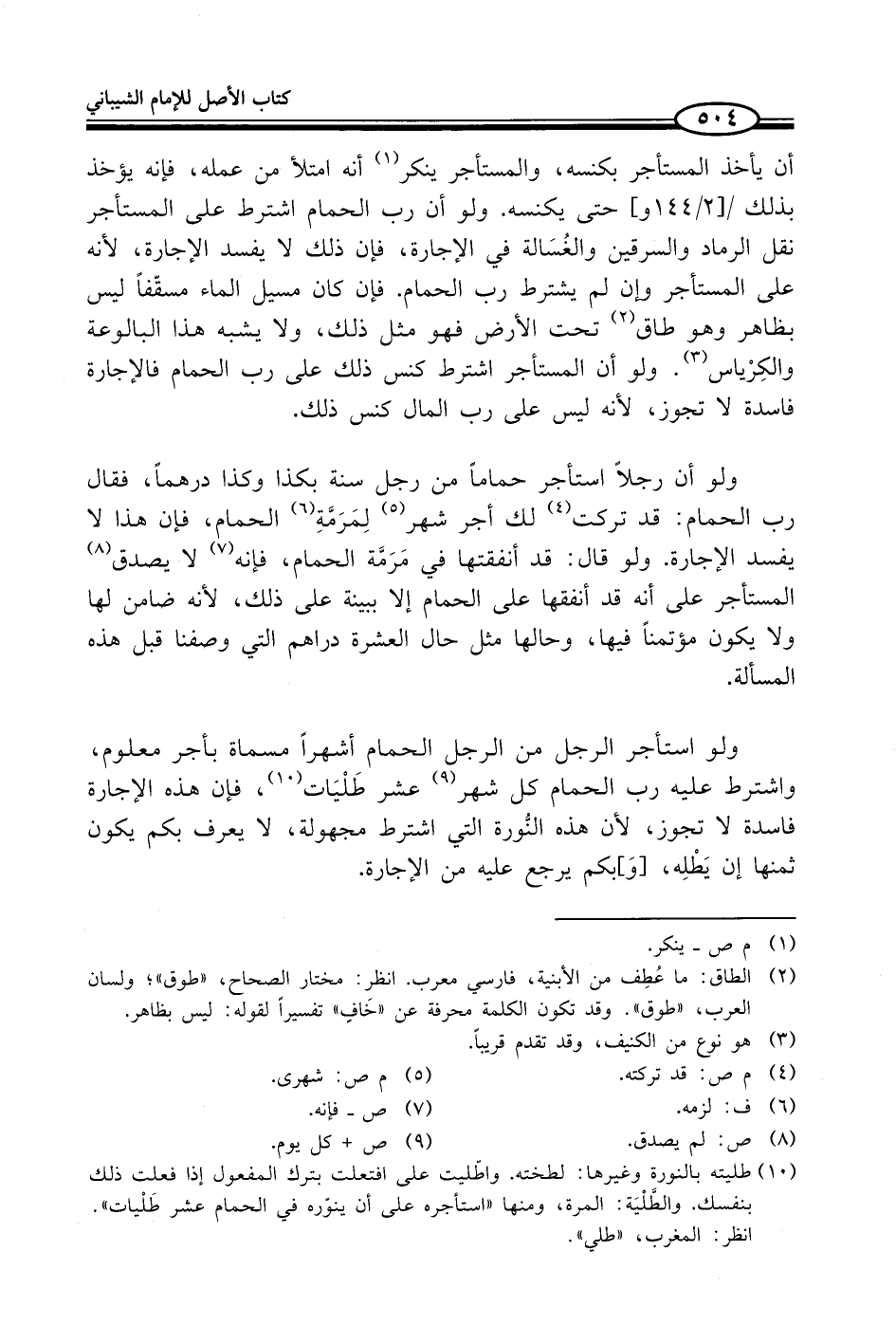 أن يأخذ المستأجر بكنسه، والمستأجر ينكر (¬1) أنه امتلأ من عمله، فإنه يؤخذ بذلك حتى يكنسه. ولو أن رب الحمام اشترط على المستأجر نقل الرماد والسرقين والغُسَالة في الإجارة، فإن ذلك لا يفسد الإجارة، لأنه على المستأجر وإن لم يشترط رب الحمام. فإن كان مسيل الماء مسقّفاً ليس بظاهر وهوطاق (¬2) تحت الأرض فهو مثل ذلك، ولا يشبه هذا البالوعة والكِرْياس (¬3). ولو أن المستأجر اشترط كنس ذلك على رب الحمام فالإجارة فاسدة لا تجوز، لأنه ليس على رب المال كنس ذلك.