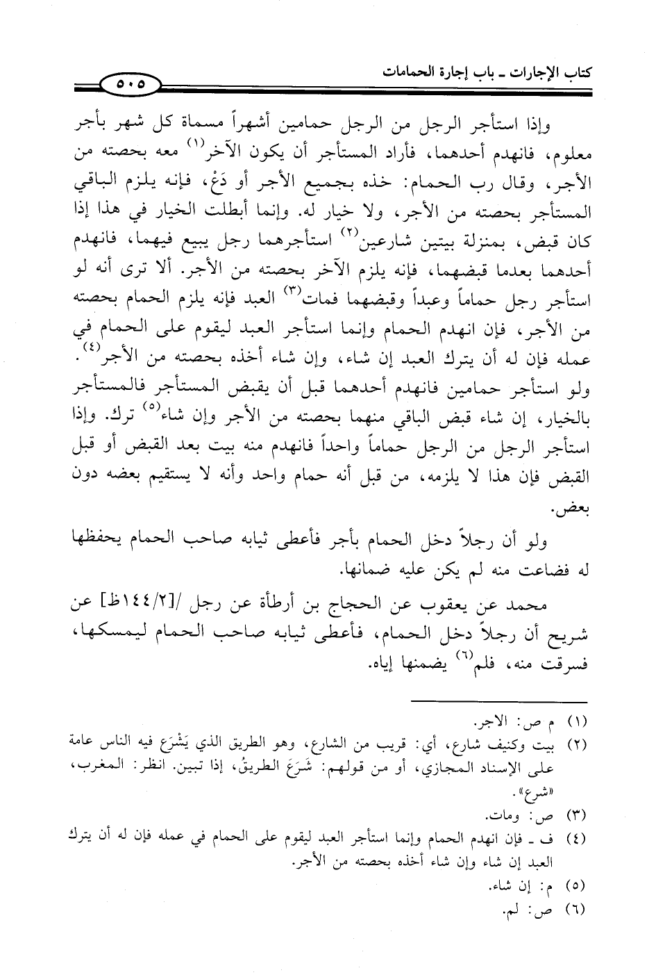 وإذا استأجر الرجل من الرجل حمامين أشهراً مسماة كل شهر بأجر معلوم، فانهدم أحدهما، فأراد المستأجر أن يكون الآخر (¬1) معه بحصته من الأجر، وقال رب الحمام: خذه بجميع الأجر أو دَعْ، فإنه يلزم الباقي المستأجر بحصته من الأجر، ولا خيار له. وإنما أبطلت الخيار في هذا إذا كان قبض، بمنزلة بيتين شارعين (¬2) استأجرهما رجل يبيع فيهما، فانهدم أحدهما بعدما قبضهما، فإنه يلزم الآخر بحصته من الأجر. ألا ترى أنه لو استأجر رجل حماماً وعبداً وقبضهما فمات (¬3) العبد فإنه يلزم الحمام بحصته من الأجر، فإن انهدم الحمام وإنما استأجر العبد ليقوم على الحمام في عمله فإن له أن يترك العبد إن شاء، وإن شاء أخذه بحصته من الأجر (¬4). ولو استأجر حمامين فانهدم أحدهما قبل أن يقبض المستأجر فالمستأجر بالخيار، إن شاء قبض الباقي منهما بحصته من الأجر وإن شاء (¬5) ترك. وإذا استأجر الرجل من الرجل حماماً واحداً فانهدم منه بيت بعد القبض أو قبل القبض فإن هذا لا يلزمه، من قبل أنه حمام واحد وأنه لا يستقيم بعضه دون بعض.