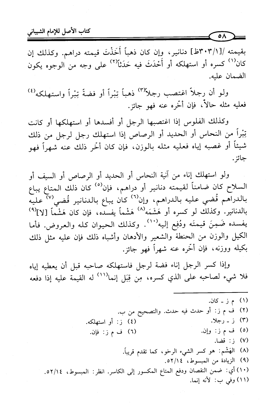 وكذلك الفلوس إذا اغتصبها الرجل أو أفسدها أو استهلكها أو كانت تِبْراً من النحاس أو الحديد أو الرصاص إذا استهلك رجل لرجل من ذلك شيئاً أو غصبه إياه فعليه مثله بالوزن، فإن كان أخّر ذلك عنه شهراً فهو جائز.