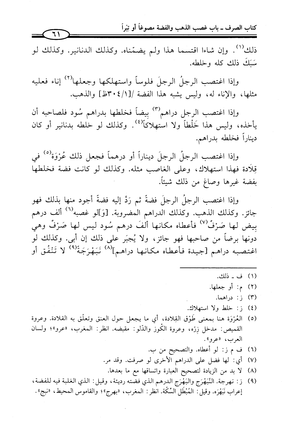 وإذا اغتصب الرجلُ الرجلَ ديناراً أو درهماً فجعل ذلك عُرْوَة (¬5) في قِلاَدة فهذا استهلاك، وعلى الغاصب مثله. وكذلك لو كانت فضة فخلطها بفضة غيرها وصاغ من ذلك شيئاً.